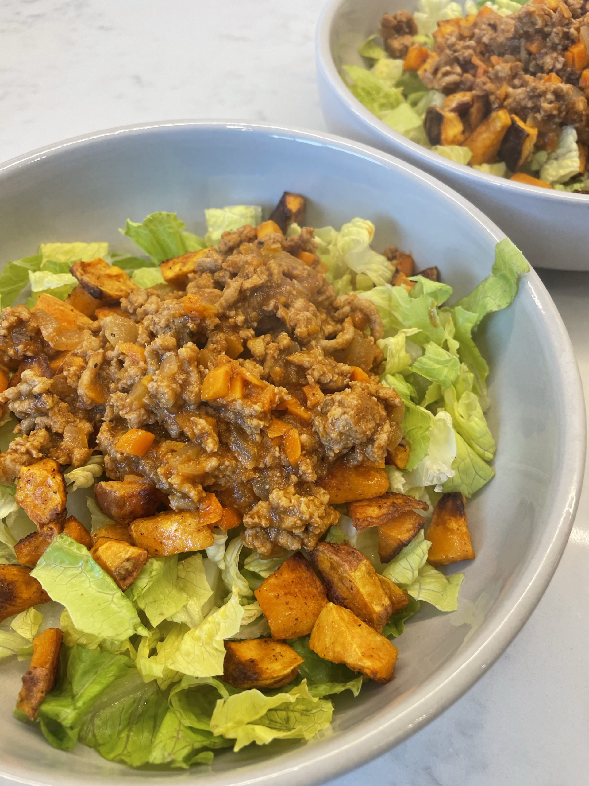 Now it’s time to plate: add a handful of your diced lettuce to a bowl with some sweet potatoes. Add in your turkey sloppy joe mixture and top with some avocado and diced green onions!