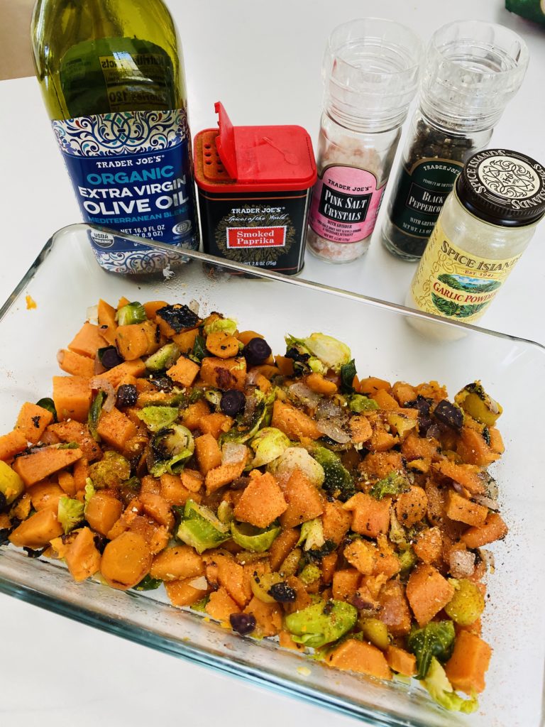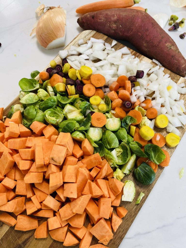 While your quinoa is cooking, you will now need to chop up all of your vegetables! You can really use whatever vegetables you have at home. If sweet potato isn’t your thing, you can use a regular potato, too. Peel your potato and cut it up into approximately 1/2-inch pieces. Then wash and cut your brussels sprouts into halves or quarters. Some of the leaves will fall off when you cut these up, but that’s ok you can keep all of the pieces because you will just have different textures at the end! Peel and slice up some carrots, I found these super fun and colorful carrots at the store so I decided to use this mixed bag for some more color in the bake! Lastly, dice up approximate ½ of a large white onion. I always cut my onion up last because I always ALWAYS tear up when I cut onions so I would rather minimize the number of tears that I shed in the chopping process!!!!