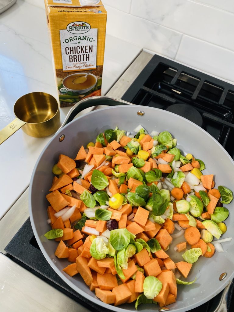 Next, you’re going to take all of your veggies and place them in a sauté pan and add 1 cup of chicken stock. This is going to soften up all of your veggies and get those juices flowing so that your overall cooking time in the oven isn’t too long! Let these veggies simmer for about 5 minutes or until they soften up to your liking!