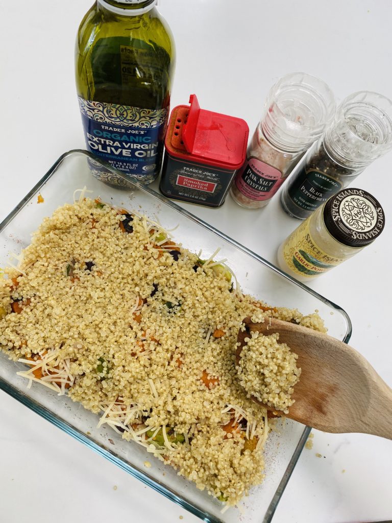 Now it is layering time!!! Once your veggies and quinoa are done cooking, we’re going to start layering everything in a glass baking dish! So first you will put all of your veggies on the bottom, and season them with half of your seasoning…paprika, garlic powder, salt and pepper! You can also add another other seasoning that you might like. If you like a little spice in your life, feel free to add red pepper flakes or any other blend of seasoning you enjoy!