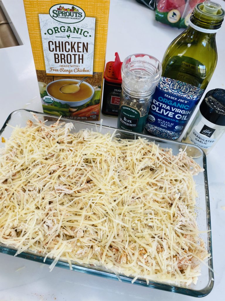 Then take your shredded chicken and spread evenly throughout the baking dish. Now it’s time to add more parmesan cheese and another round of your spices! Last but not least, you’re going to take ½ cup of your chicken stock and drizzle it all over the top of the baking dish! This will help keep everything moist and flavorful!