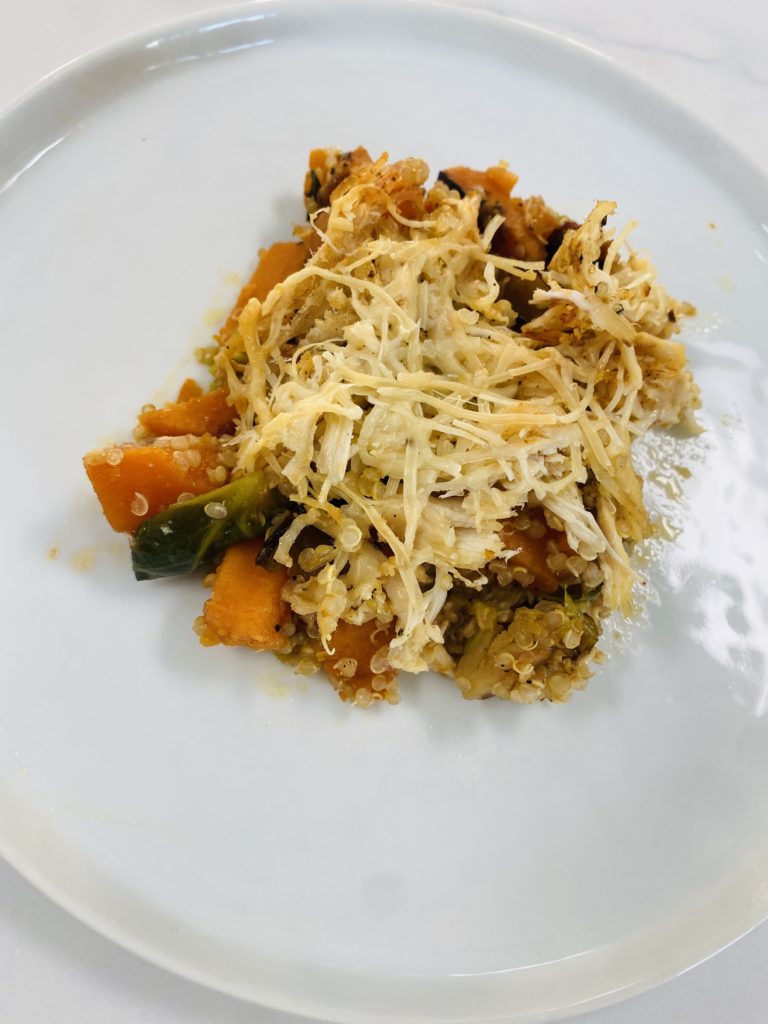 Next, you will layer in your quinoa. After we spread out the quinoa, we’re going to add a thin layer of shredded parmesan cheese.
