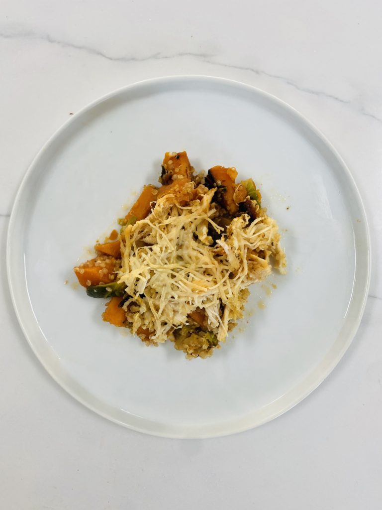 Pop this harvest bake in the oven at 400 degrees for about 15-20 minutes or until the cheese on top becomes nice and crispy! Remember that everything in this bake is already pre-cooked so this oven time is totally up to you…it’s basically to get all of those juices flowing and all of those flavors marinating together perfectly!