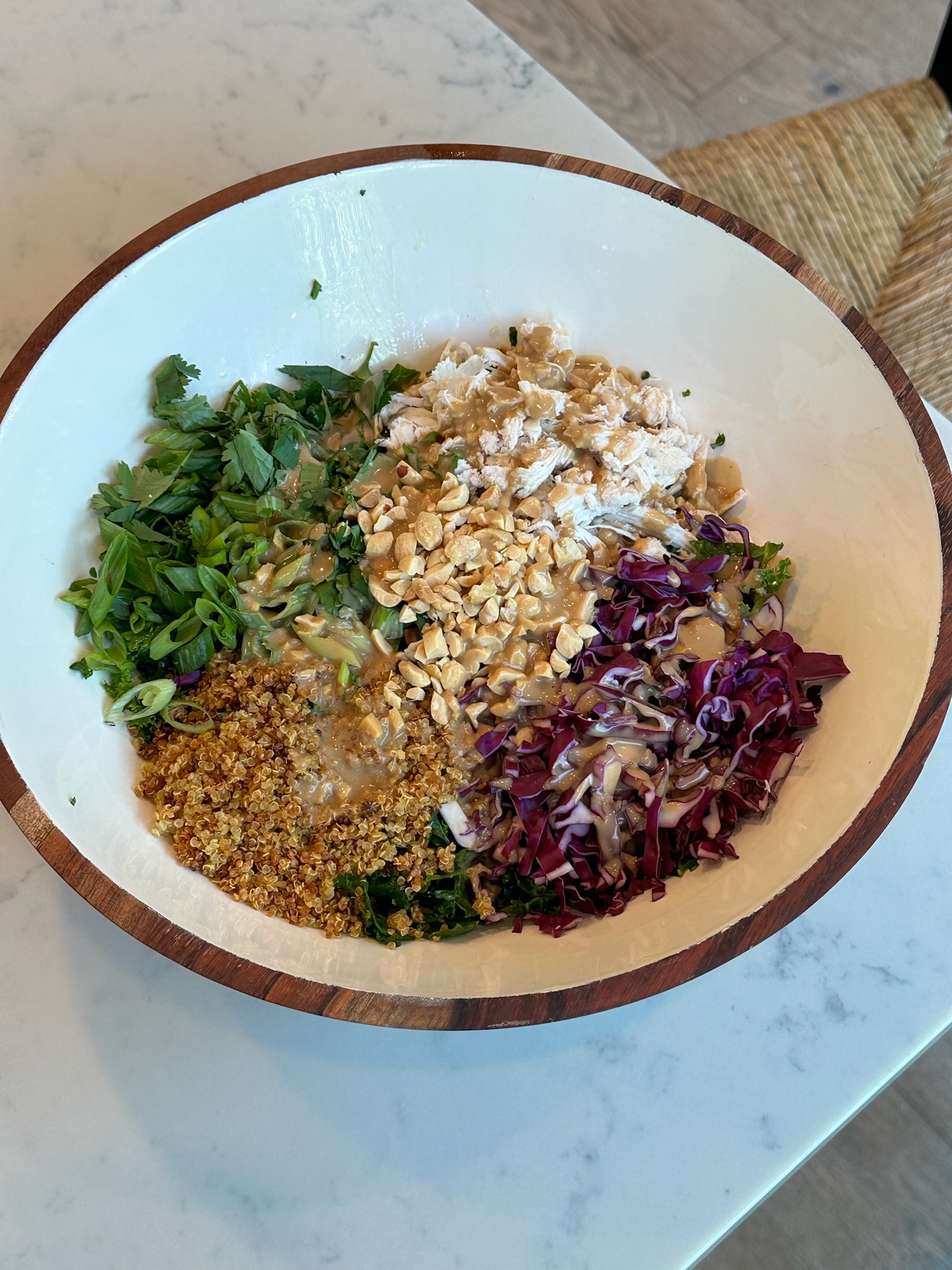 Add the toasted quinoa, prepped cabbage, green onion, cilantro, chicken, and crushed peanuts to the bowl with the kale.