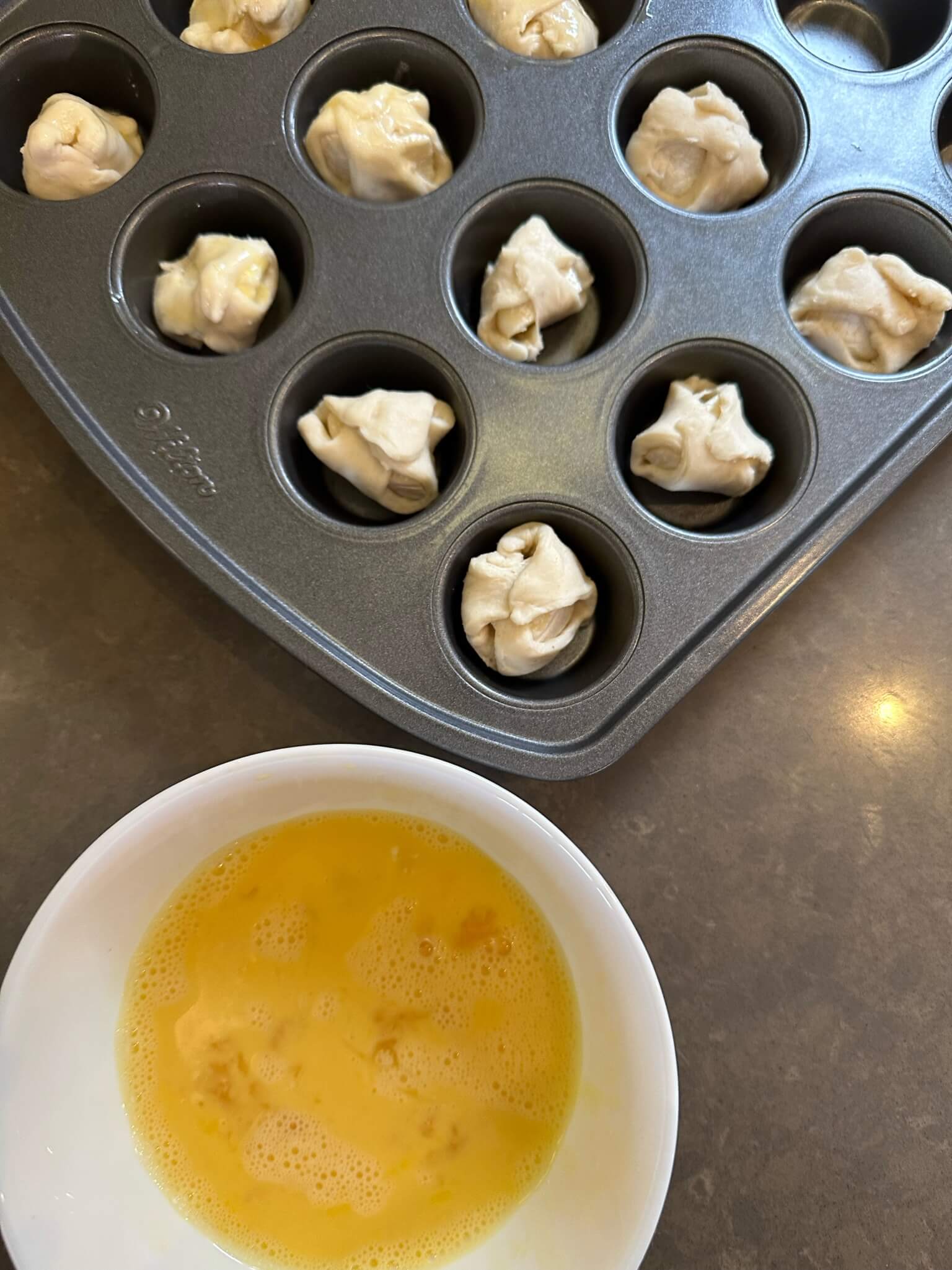 Quarter the mini brie to fit in the center of each pastry piece. Wrap the brie with the pastry and place it in the greased muffin tin.
