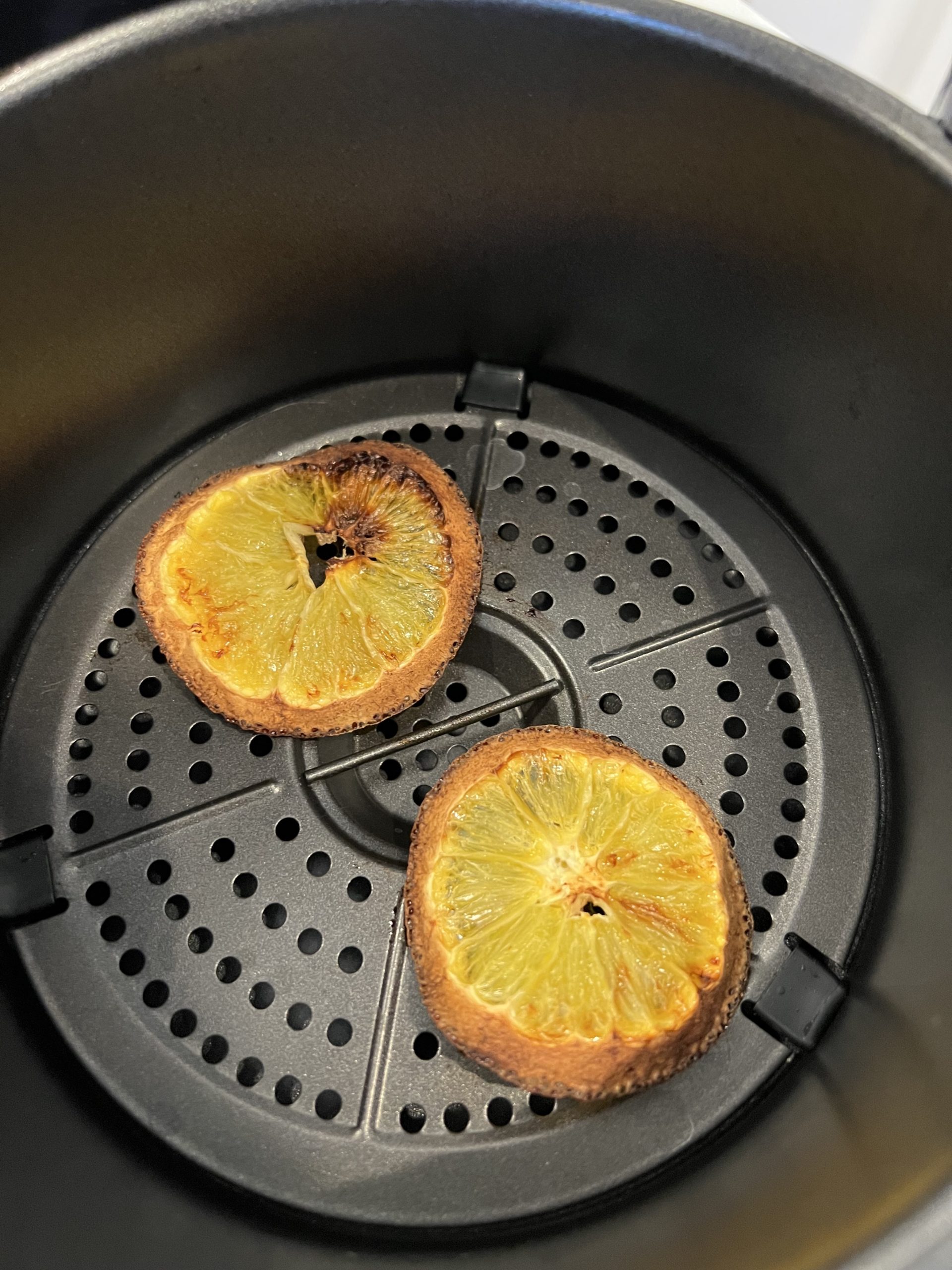 Slice your oranges and add to the air fryer for 8-10 min each side at 350 degrees.