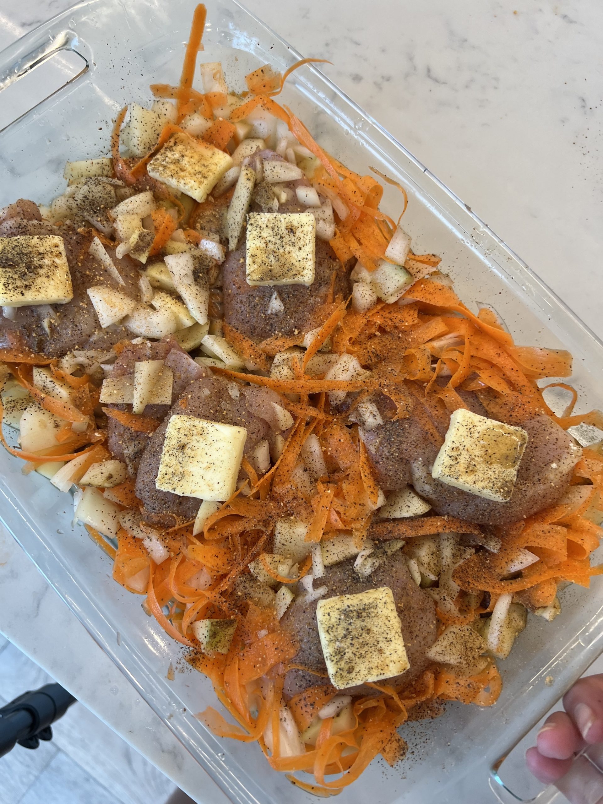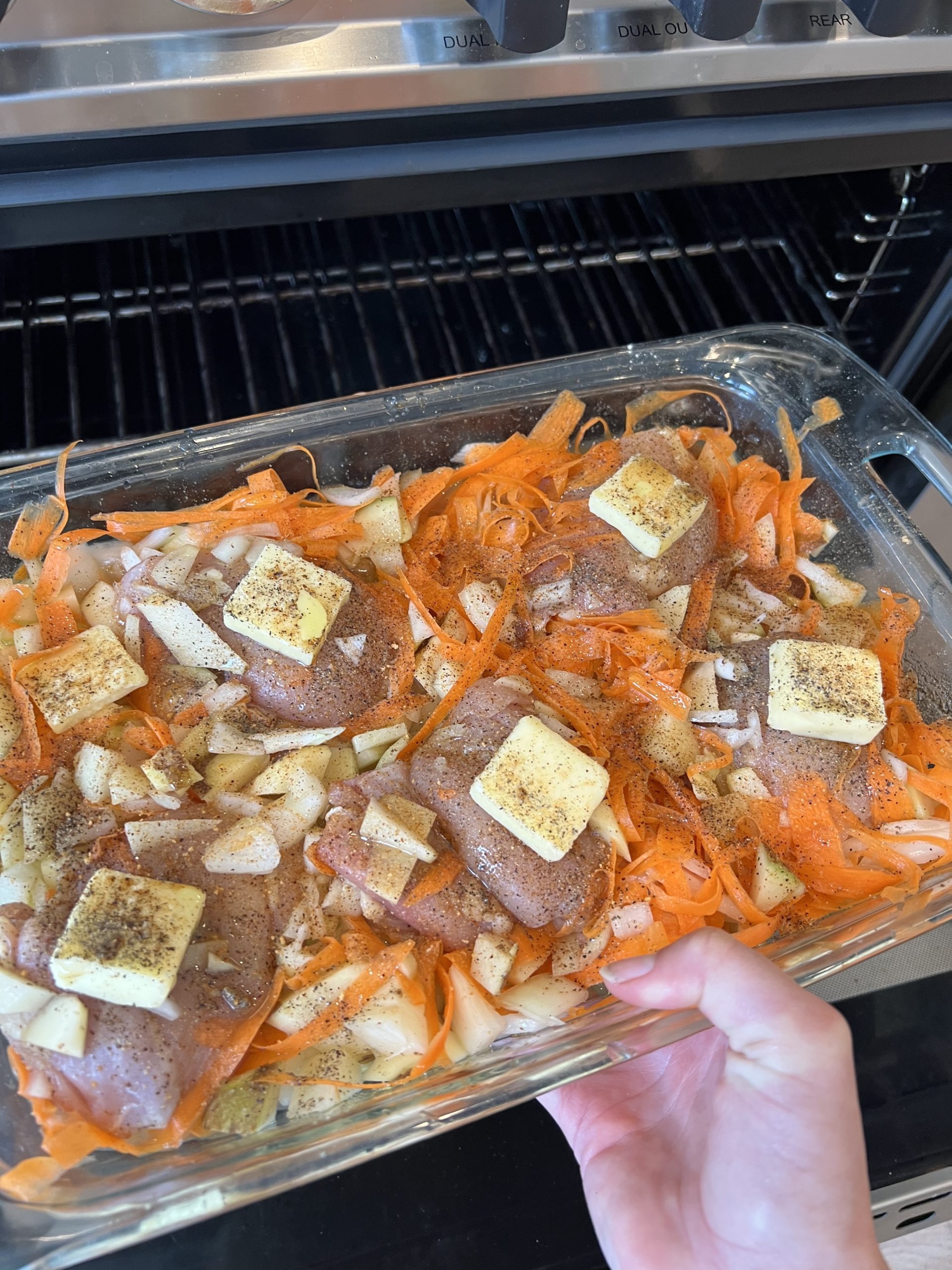 While your oven preheats, in a baking / casserole dish, season your chicken with chili powder, Lawry’s, pepper, and garlic powder. Prep your potatoes and onions by dicing, and carrots by peeling.