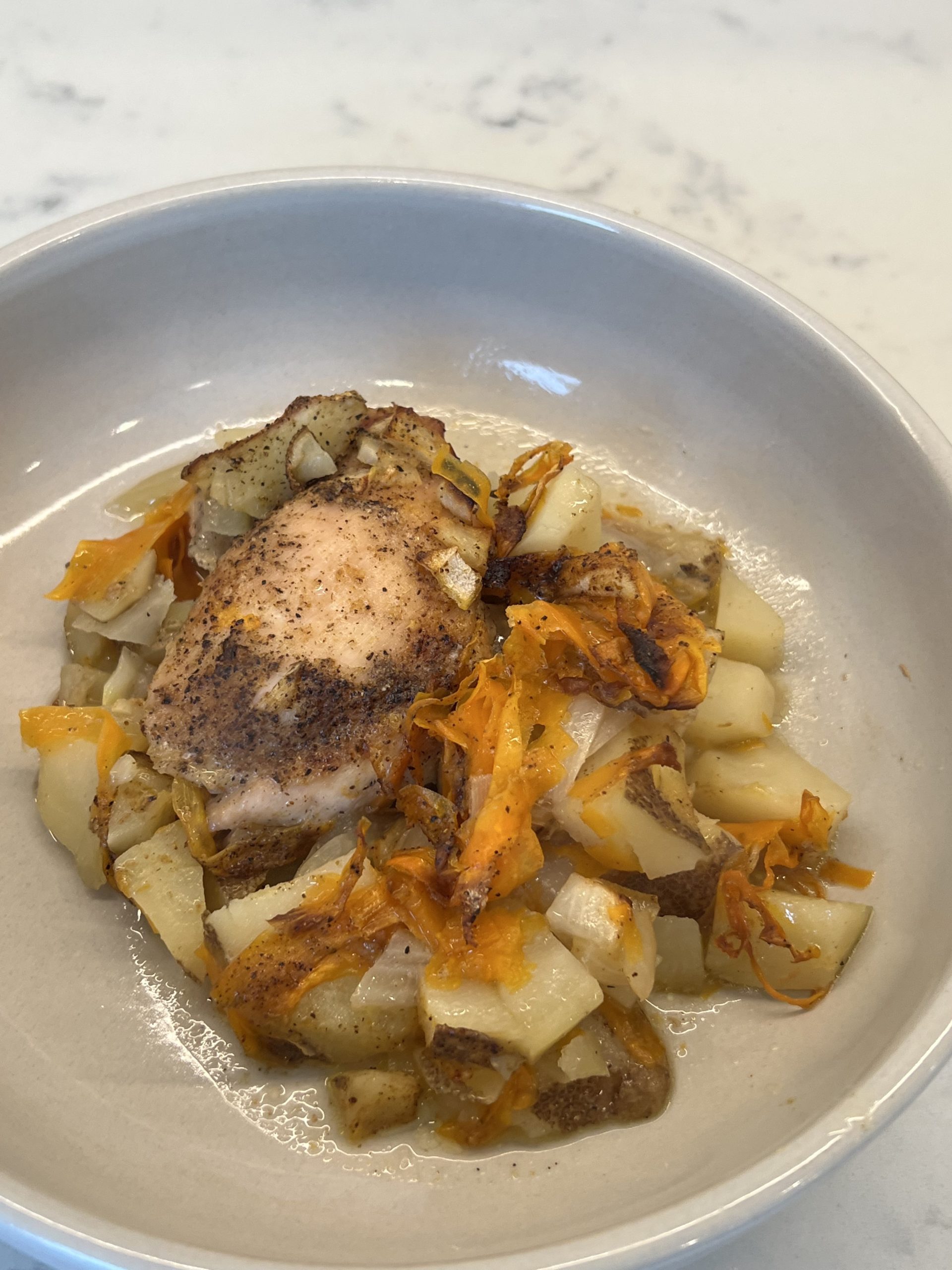 Layer in your seasoned chicken, potatoes, onions and feel free to shred your carrot directly into the dish. Spread the ingredients around the dish but make sure to leave your chicken exposed on the top!