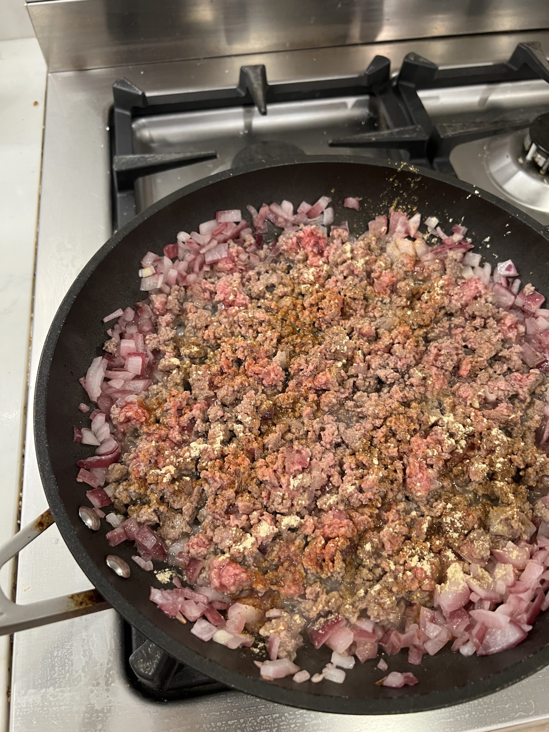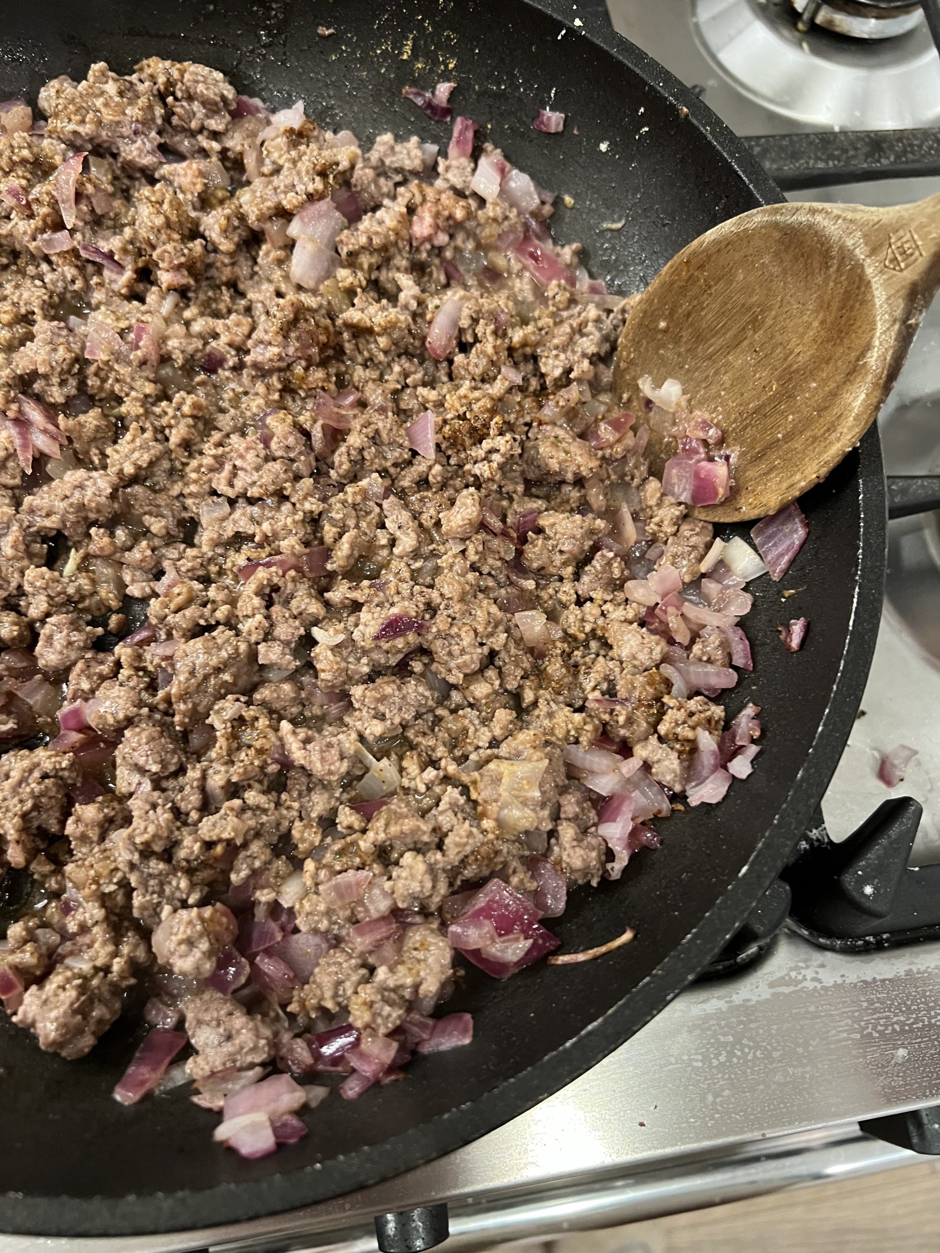 In a hot skillet, drizzle olive oil and cook your red onions for a appx 2-3 minutes, then add in your ground beef and your seasonings of garlic powder, salt, pepper, chili powder, and fajita / taco seasoning.