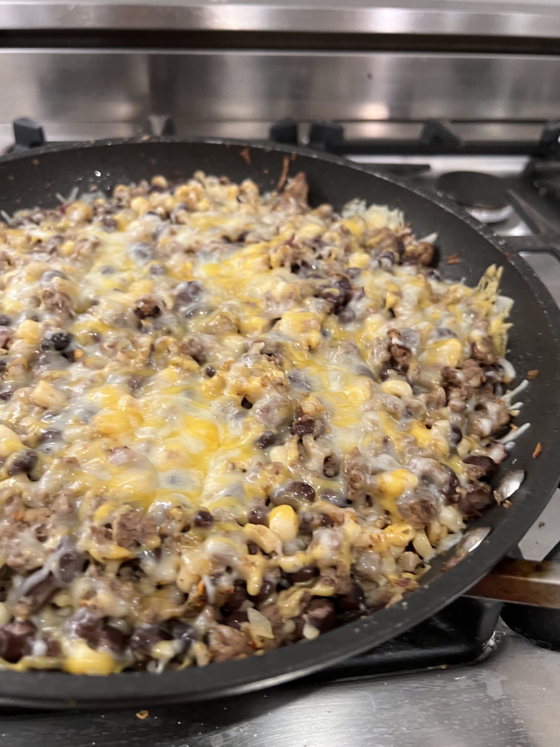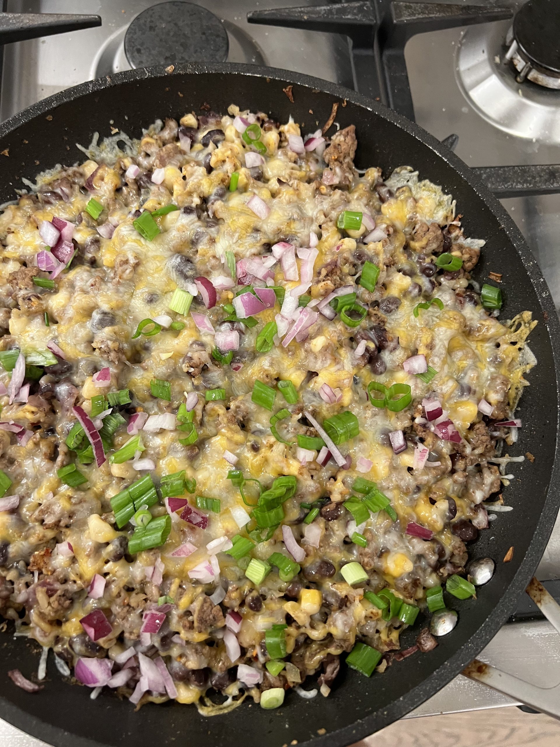 Once your beef has thoroughly cooked, add in your corn, cauliflower rice, black beans with a pinch of salt and pepper to taste and mix with your beef and onions.