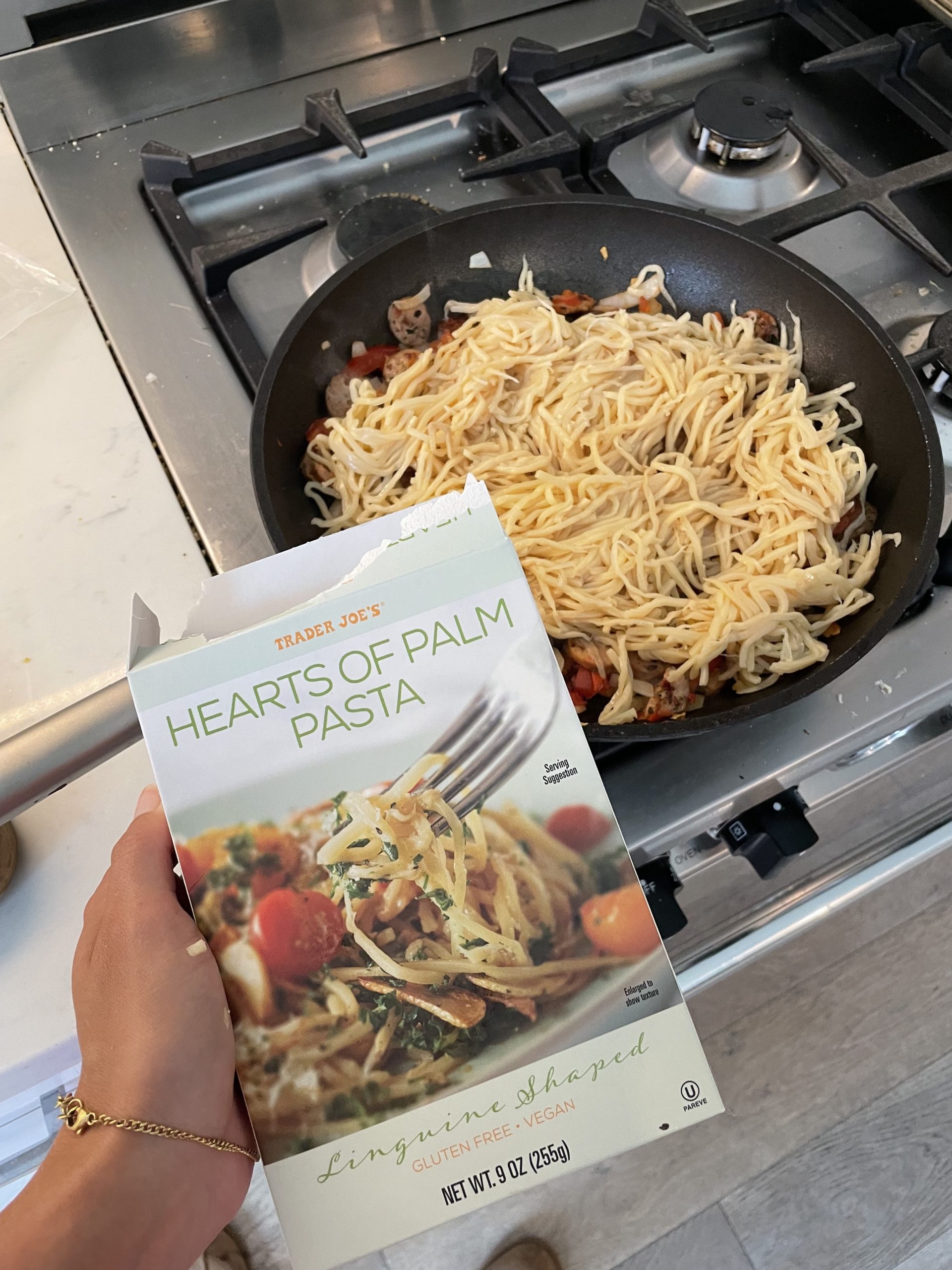 In this recipe, I am using hearts of palm pasta from Trader Joes. It’s such an amazing alternative to real pasta. Side note: I have a ton of pasta in my diet, and already ate pasta today for lunch! Nothing against it, just trying to do a little healthy swap for dinner tonight.