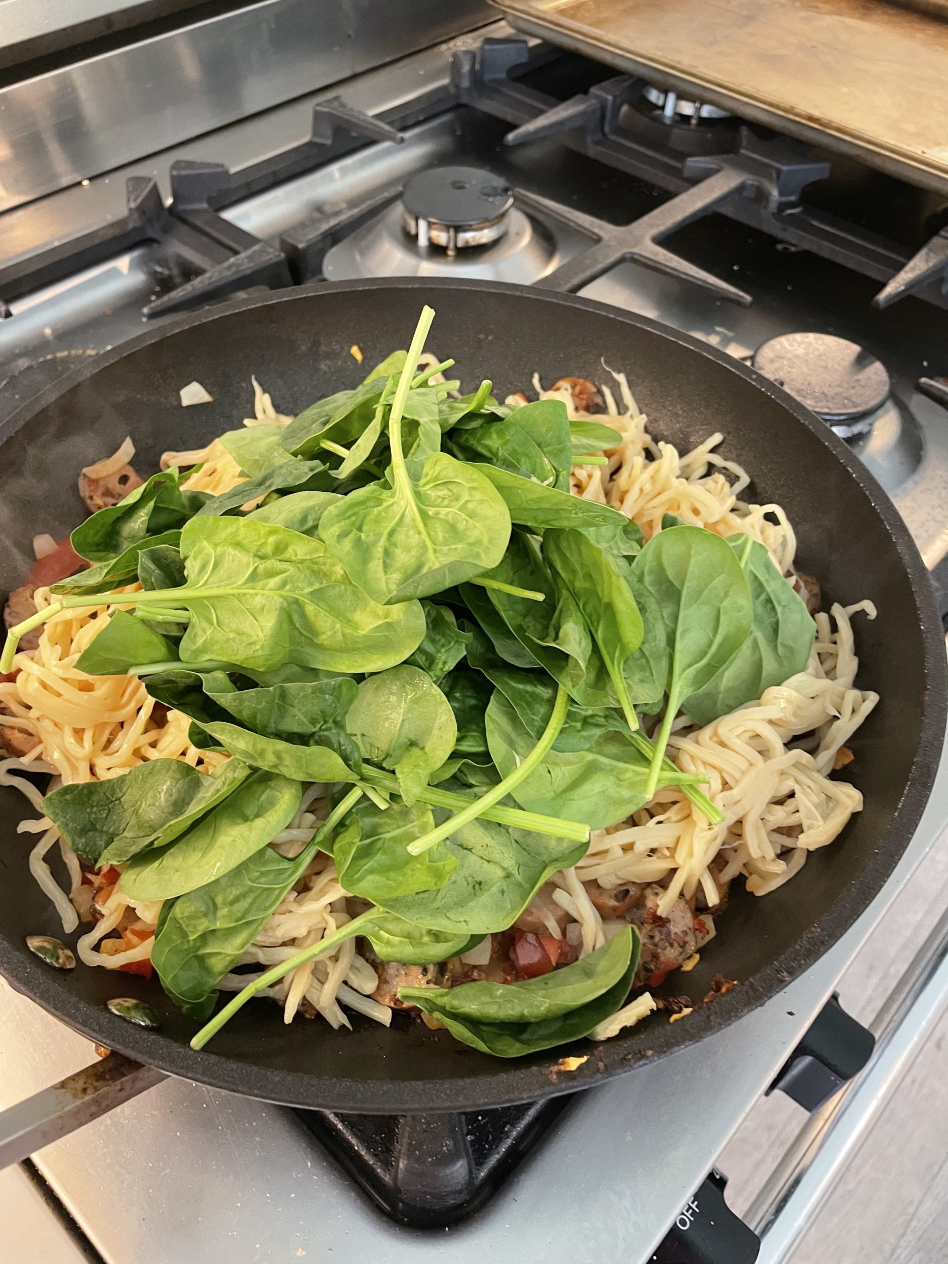Then add in your hearts of palm pasta (it’s already cooked so it just needs to be heated up for a few minutes).