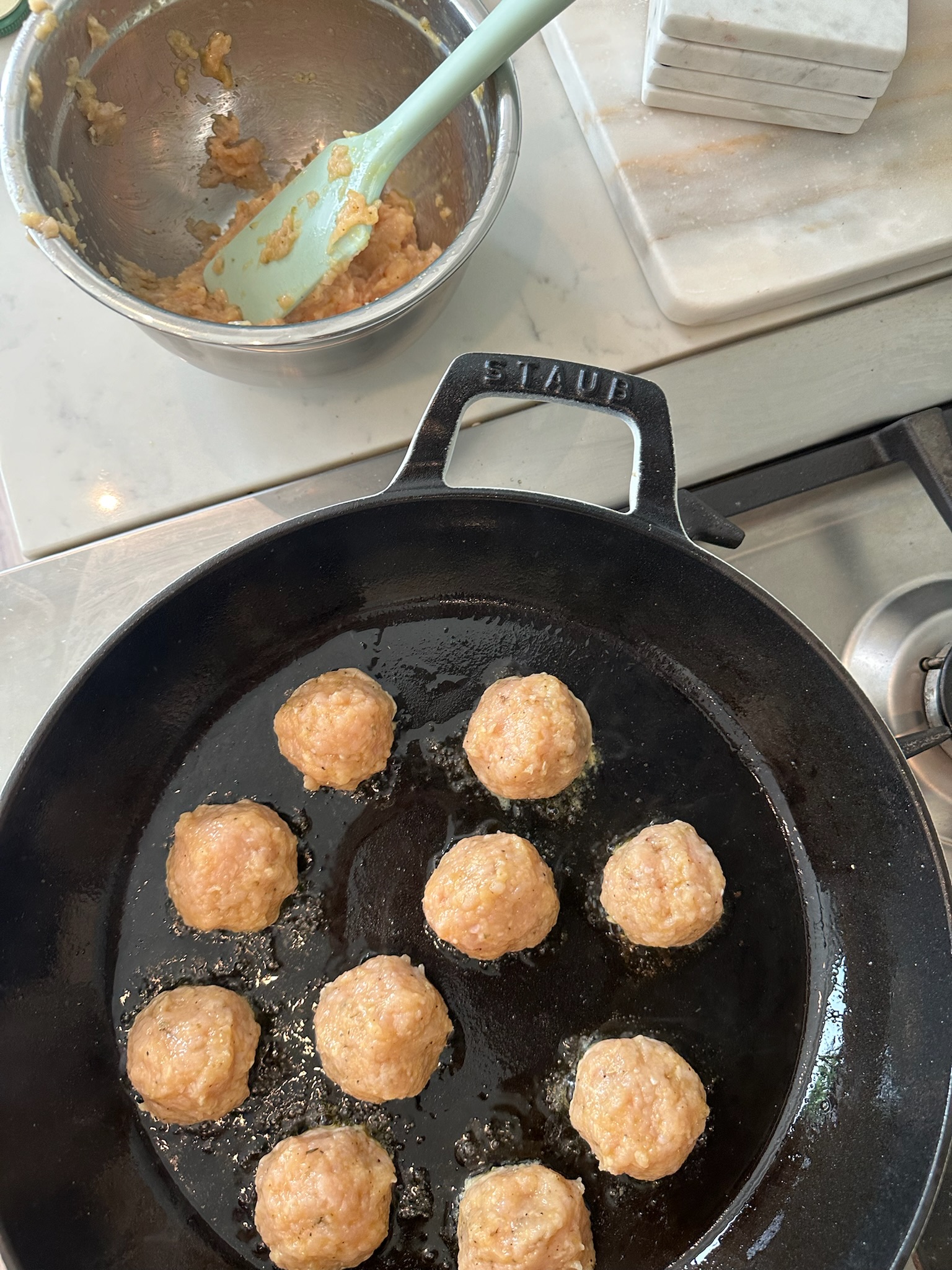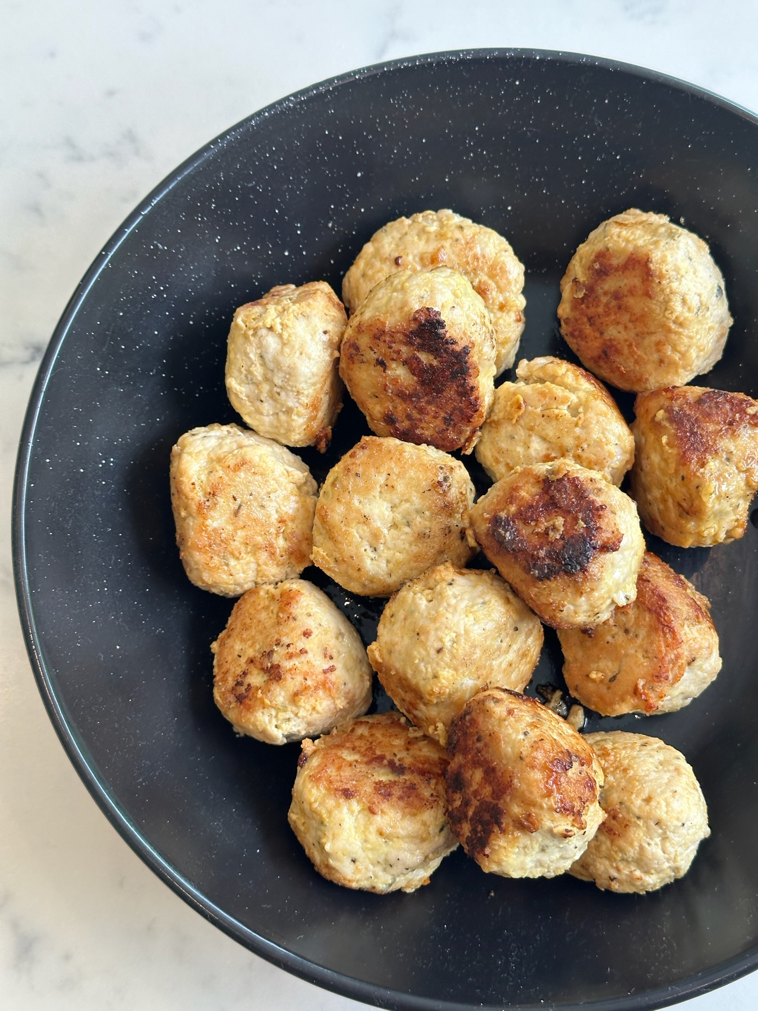 First make your chicken meatballs! Combine the ground chicken, an egg, seasonings in a bowl and mix. Form meatballs from the mix. On medium stove top heat, drizzle a little olive oil in a pan, and toss in (gently! because these are flourless they’re a little more flexible!) the meatballs. Cook for a few min on each side, then leave on low heat for 5 minutes to ensure they’re full cooked.