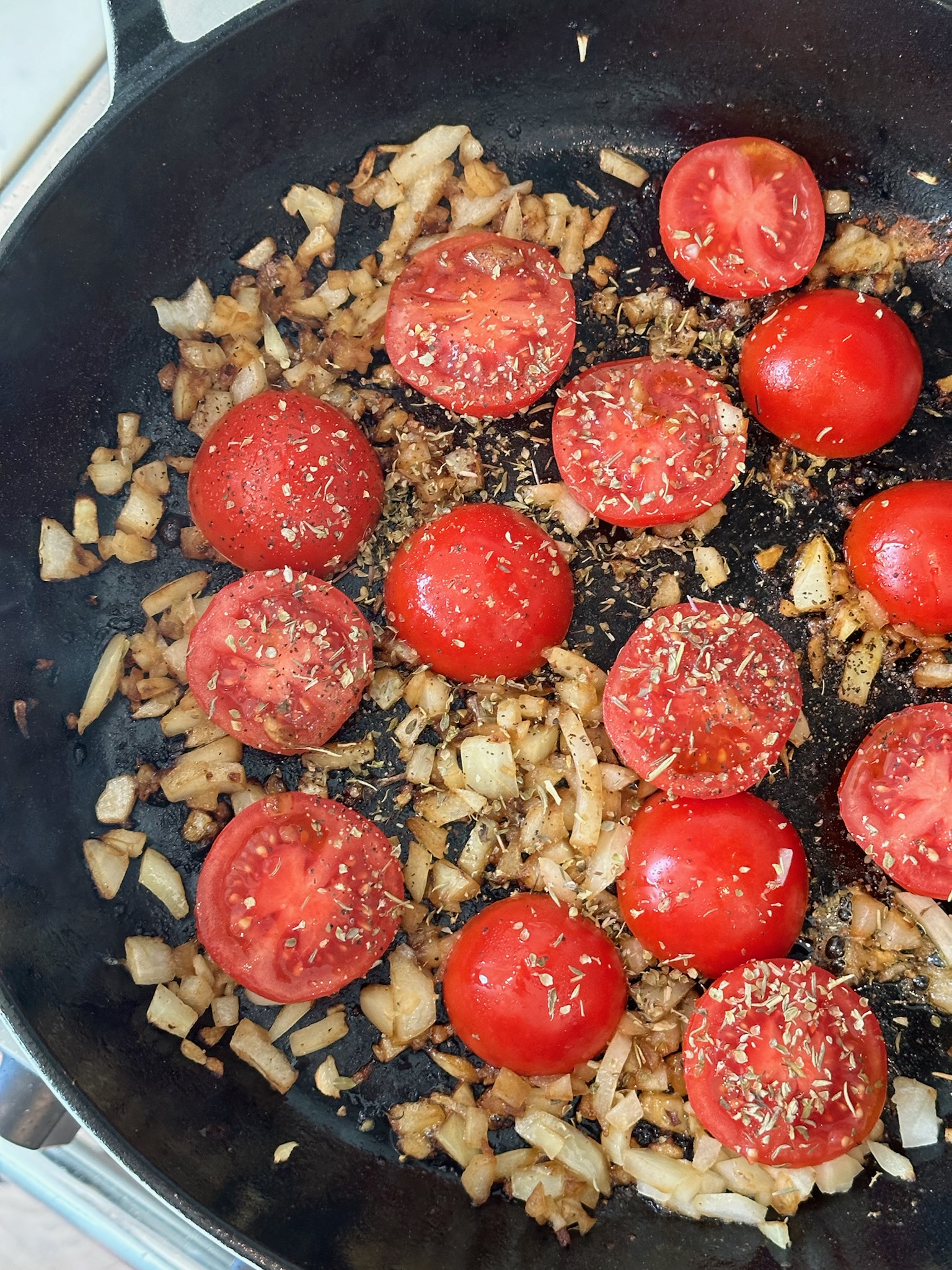 In the same pan you used for the meatballs, toss in onions, tomatoes, garlic (minced or freshly diced), a little more olive oil, and a little more Italian seasoning in the pan.