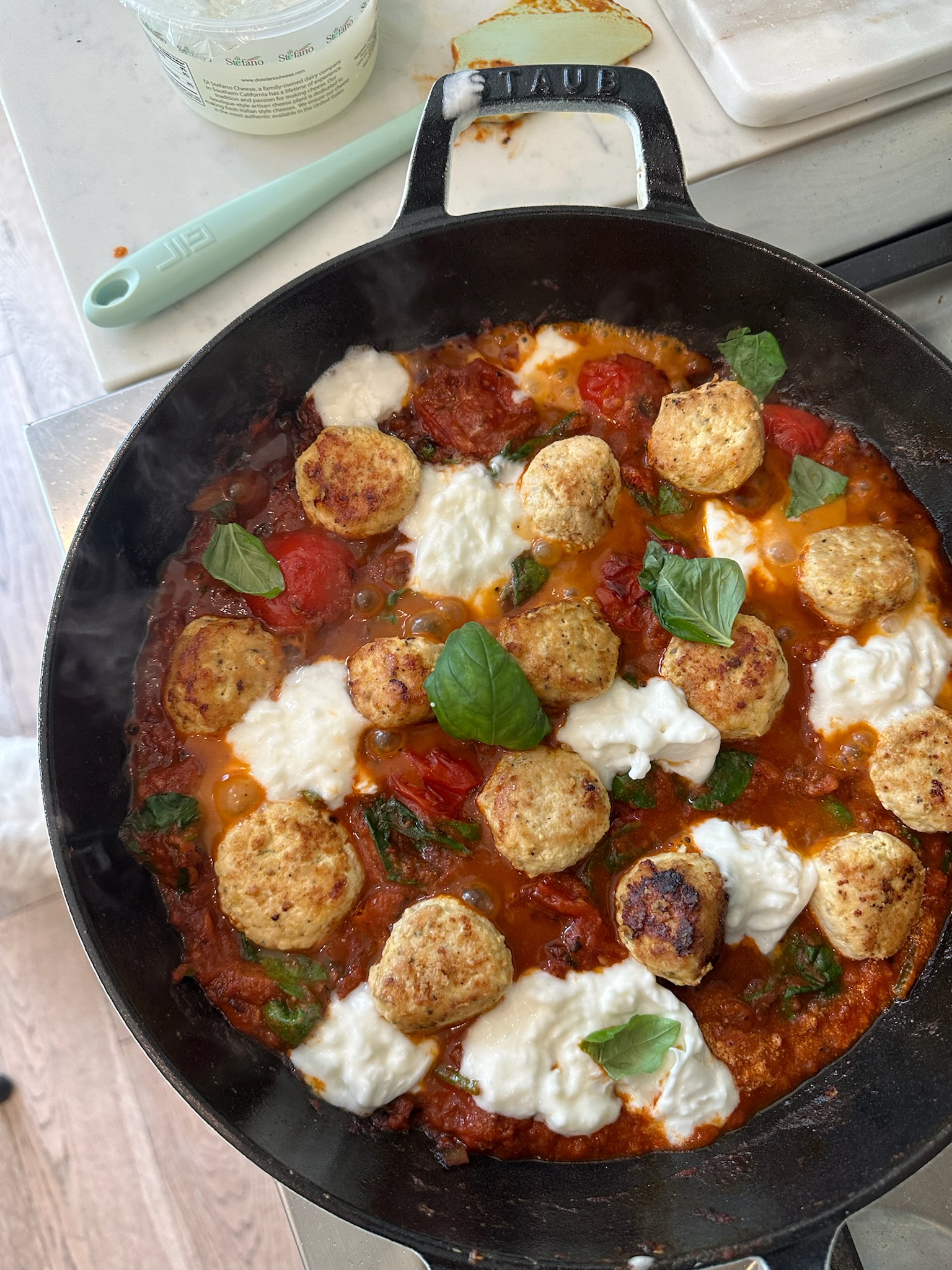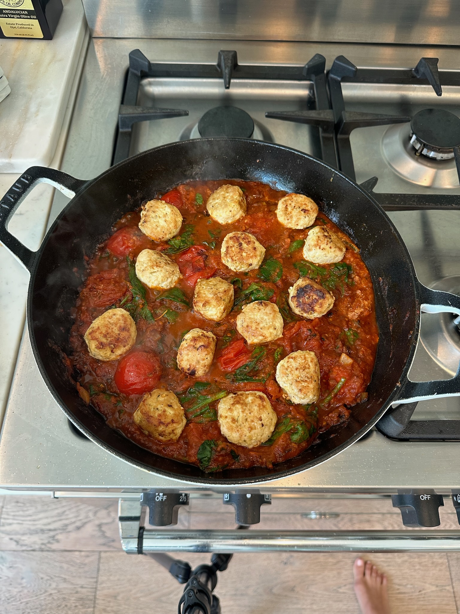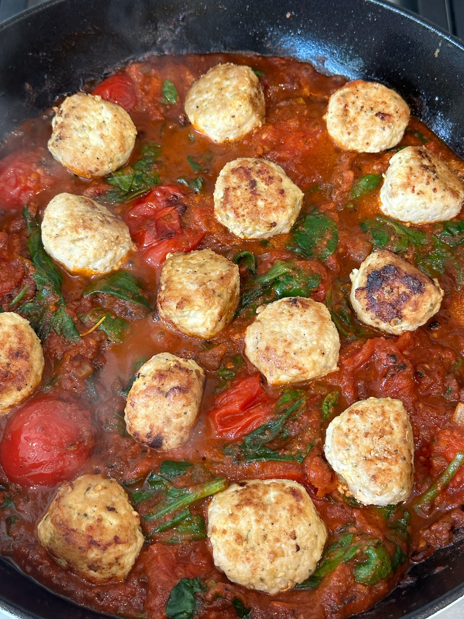 Simmer on low for all the flavors to combine for a few min, then place the meatballs right on top of the tomato, spinach dish.