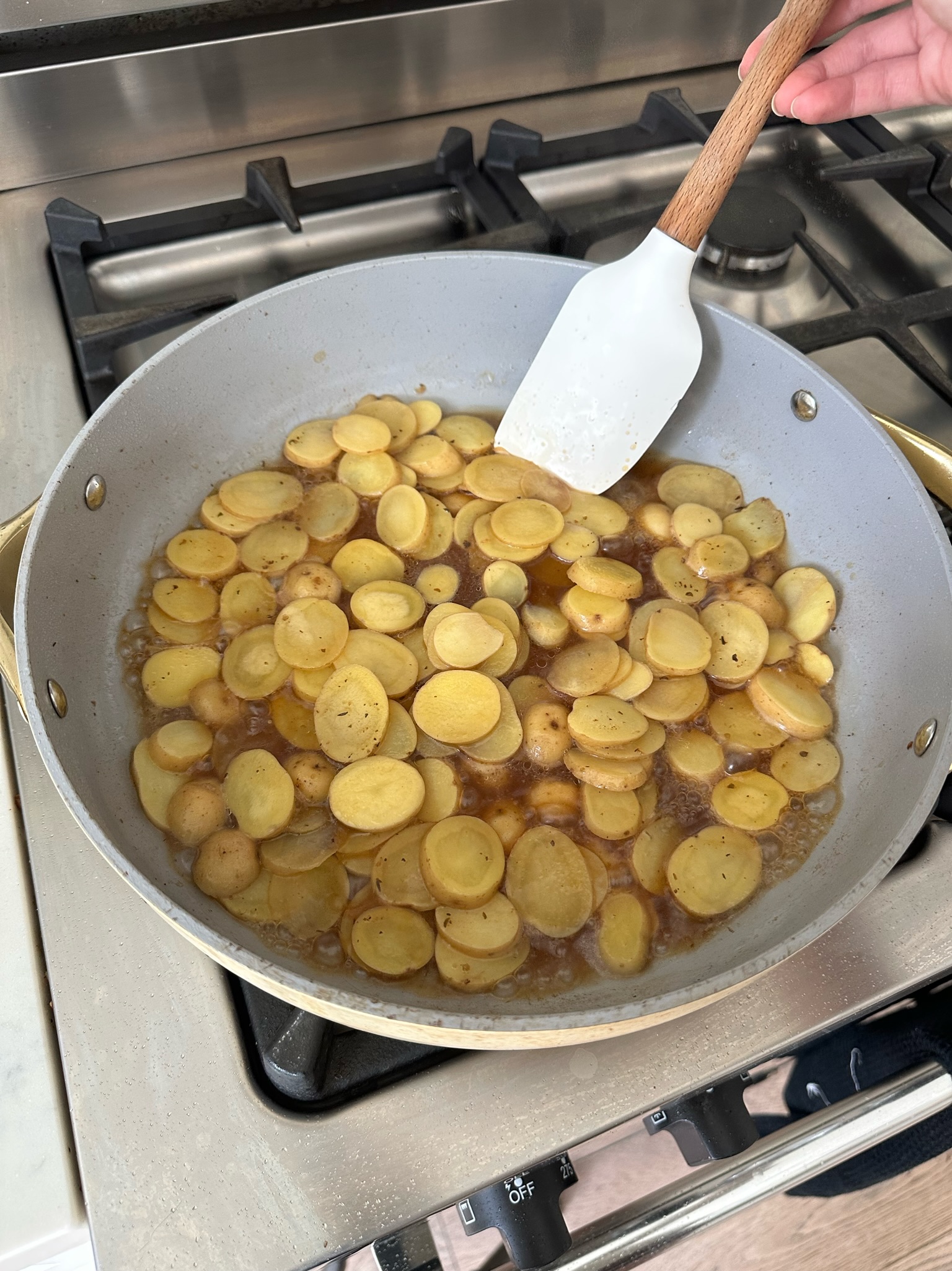 Add the sliced baby potatoes to the pan along with water, bringing it to a boil. Stir constantly to ensure thorough cooking. Cook until the water evaporates, then introduce diced onion and butter to the pan.