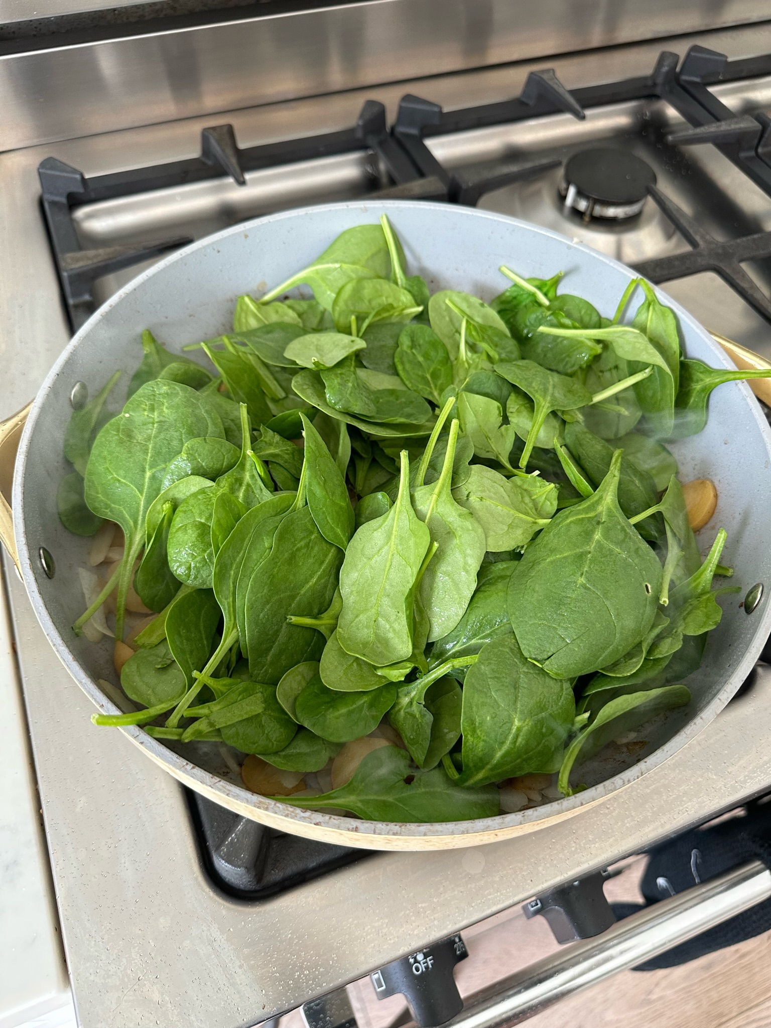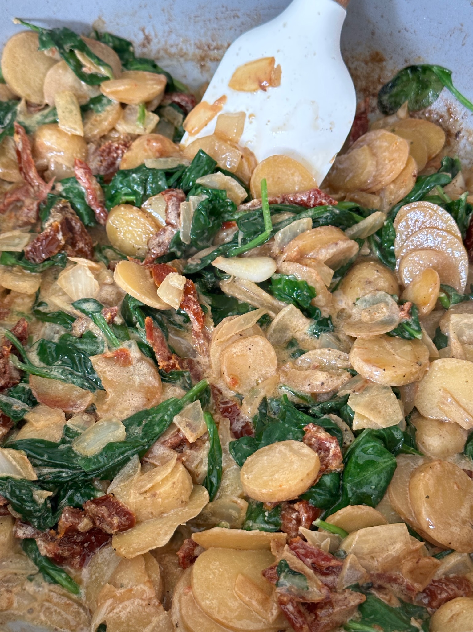 Sauté for 2-3 minutes before incorporating spinach, sautéing until wilted. Add in your sundried tomatoes and their juice.