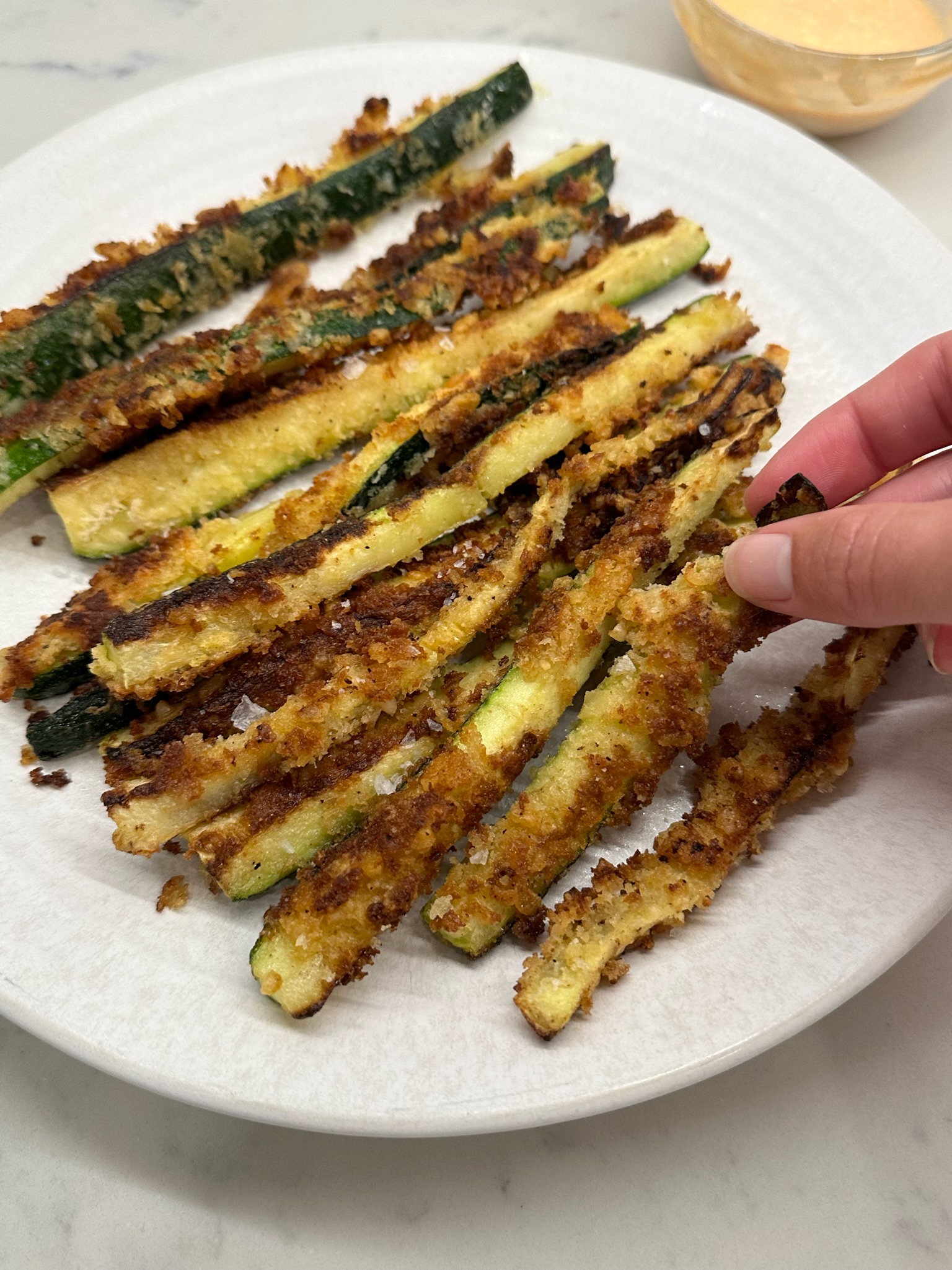 This is such an easy snack or appetizer to make. You can easily bake instead of frying if you’d prefer by preheating the oven to 425 degrees and lightly coating your e zucchini with cooking spray. Bake for 10 minutes, then remove from the oven and lightly coat with baking spray once more. Return to the oven for an additional minutes, until the crumbles are crisp and golden and the insides are tender.
