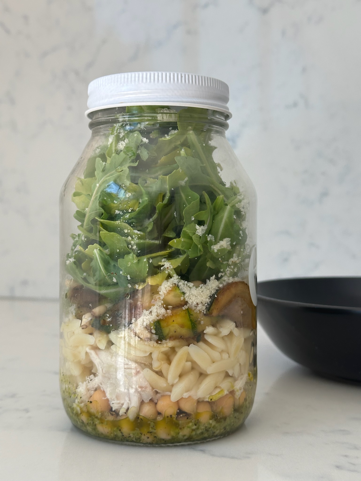 Remove both the zucchinis and orzo from the heat and allow to cook before creating your meal prepped jars.