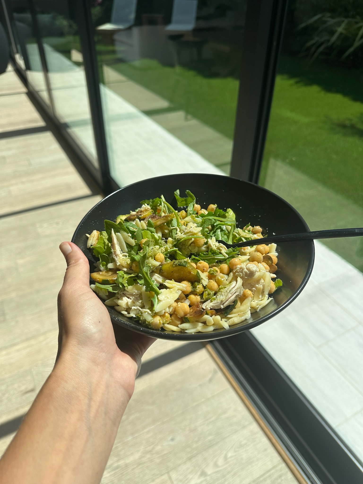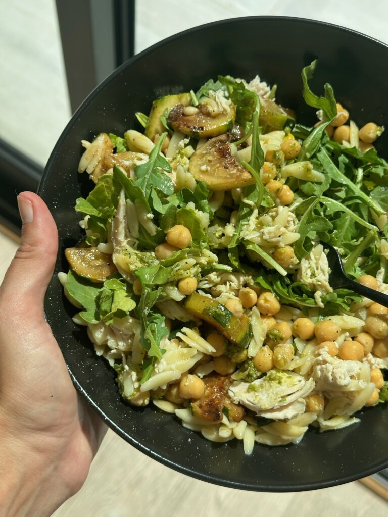 If you’re looking to bring your lunch to work, school, or anywhere on the go, here’s one of my favorites because you can enjoy it cold!! Pesto, chickpea chicken orzo & arugula!!! So yummy, easy, nutritious and filling. ENJOY!
