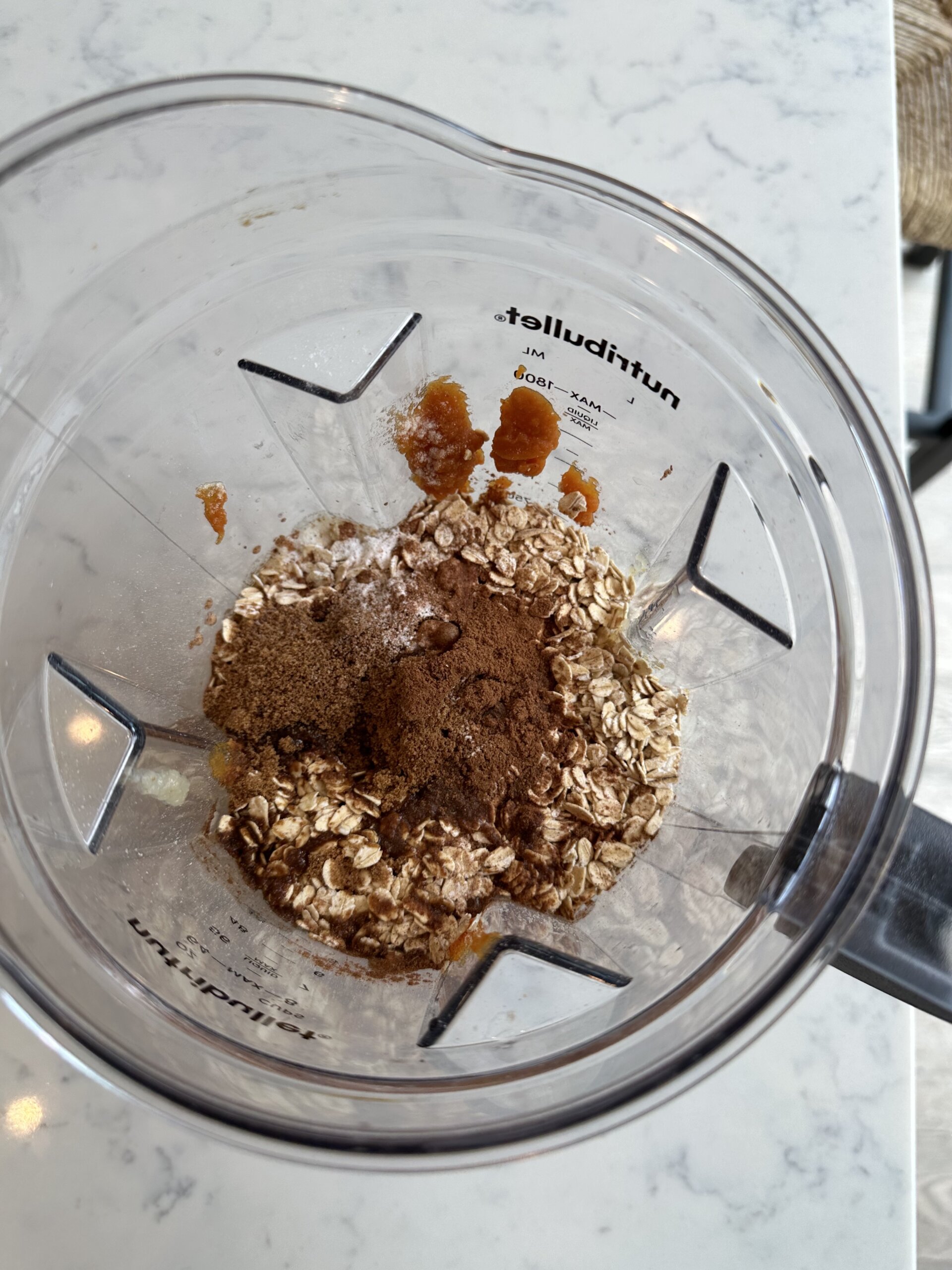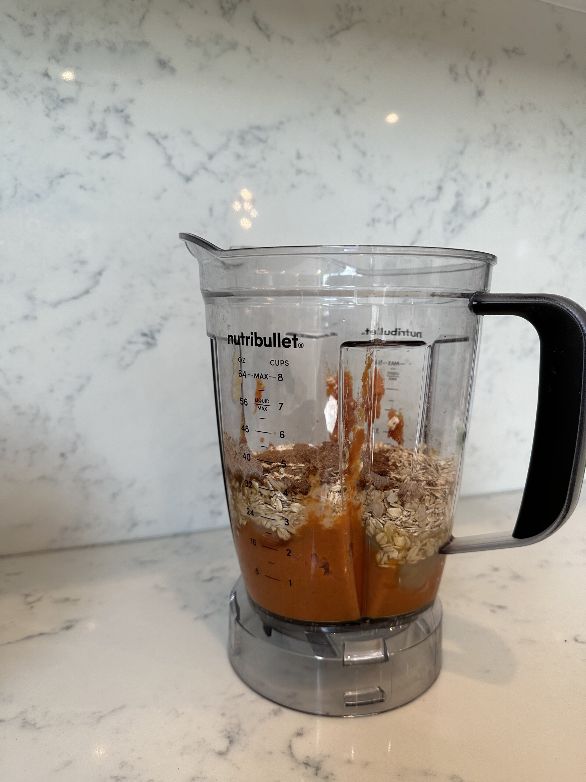 Add your pumpkin puree, apple sauce, eggs, maple syrup, rolled oats, vanilla extract, coconut sugar, pumpkin pie spice, milk of choice, and baking powder to a blender. Blend till smooth consistency – should not be lumpy!