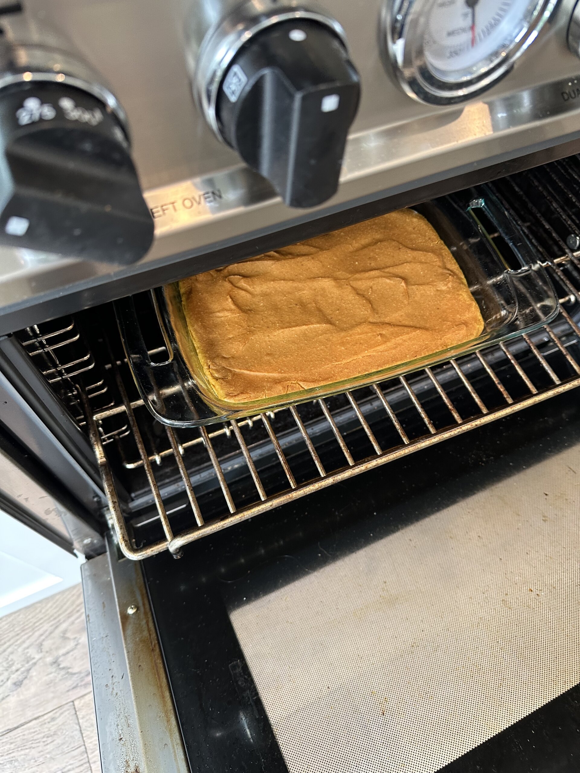 Pour your blended pumpkin mixture into the baking dish and make sure you level it out so it all cooks evenly! Bake for approximately 30 minutes at 300 degrees!