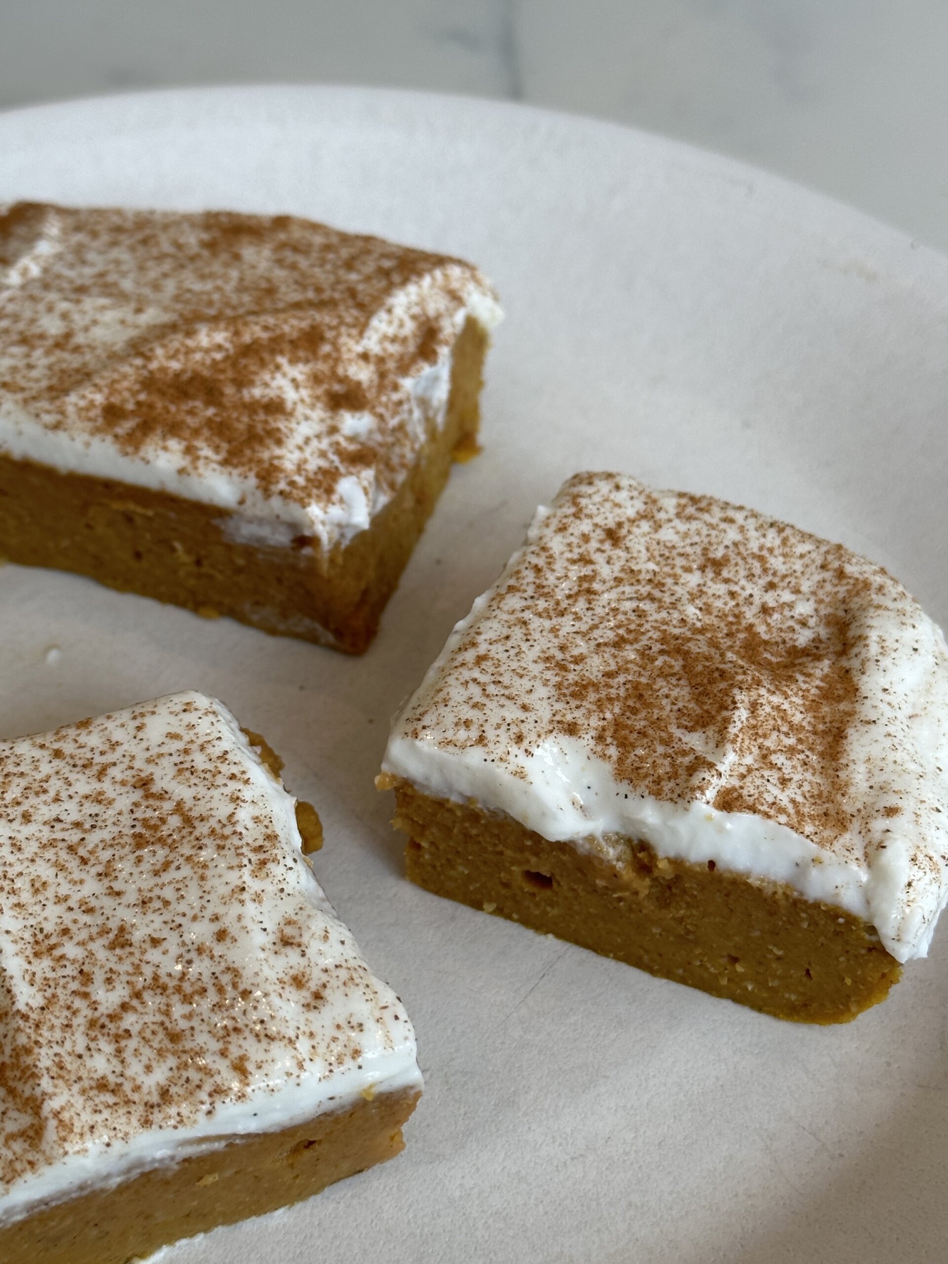 PUMPKIN PIE OAT BARS frosted with vanilla Greek yogurt! So. Amazing. 🤤 You can enjoy these for breakfast, snack, or any time you’re craving a sweet treat!! I definitely recommend serving these refrigerated!❤️ They’re also gluten-free and because of the rolled oats are a great source of important vitamins, minerals, fiber, and antioxidants
