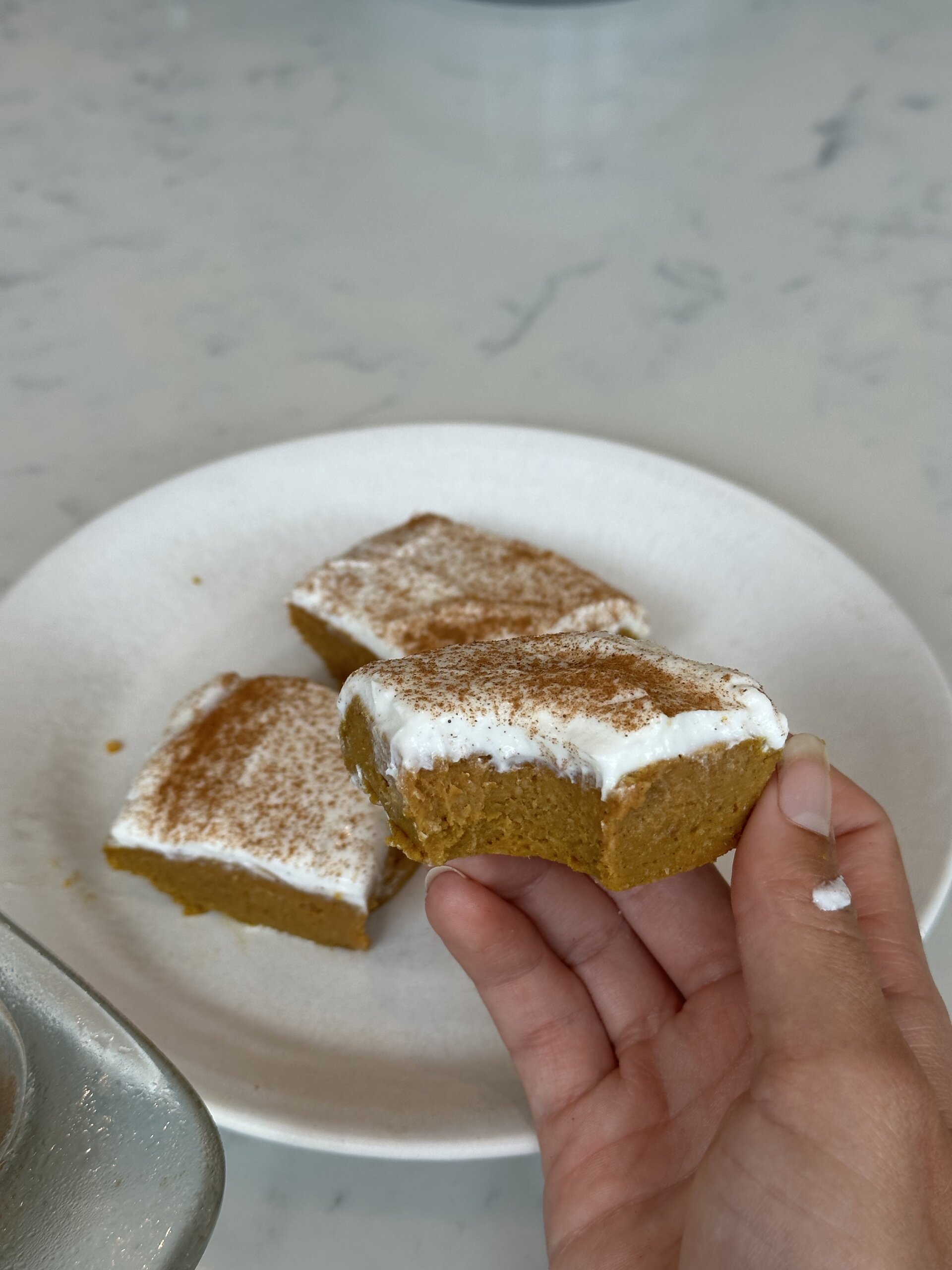 To “frost,” I found the easiest way is to use a spatula to spread vanilla greek yogurt to frost directly on the cooled bars in the baking pan! Refrigerate again so that the greek yogurt can solidify if you aren’t eating immediately!