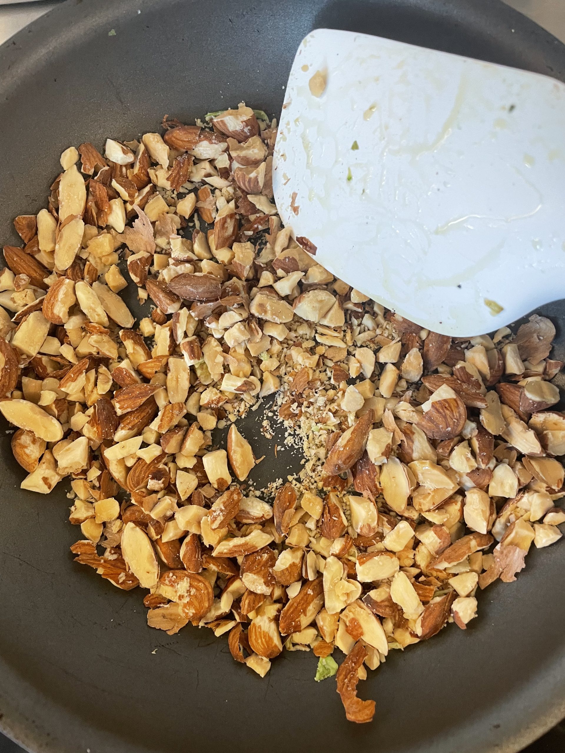 Finally, crush up your almonds and then toast them in a frying pan on medium heat for about 7-8 minutes, or until they start to brown, slightly and then add to salad!!