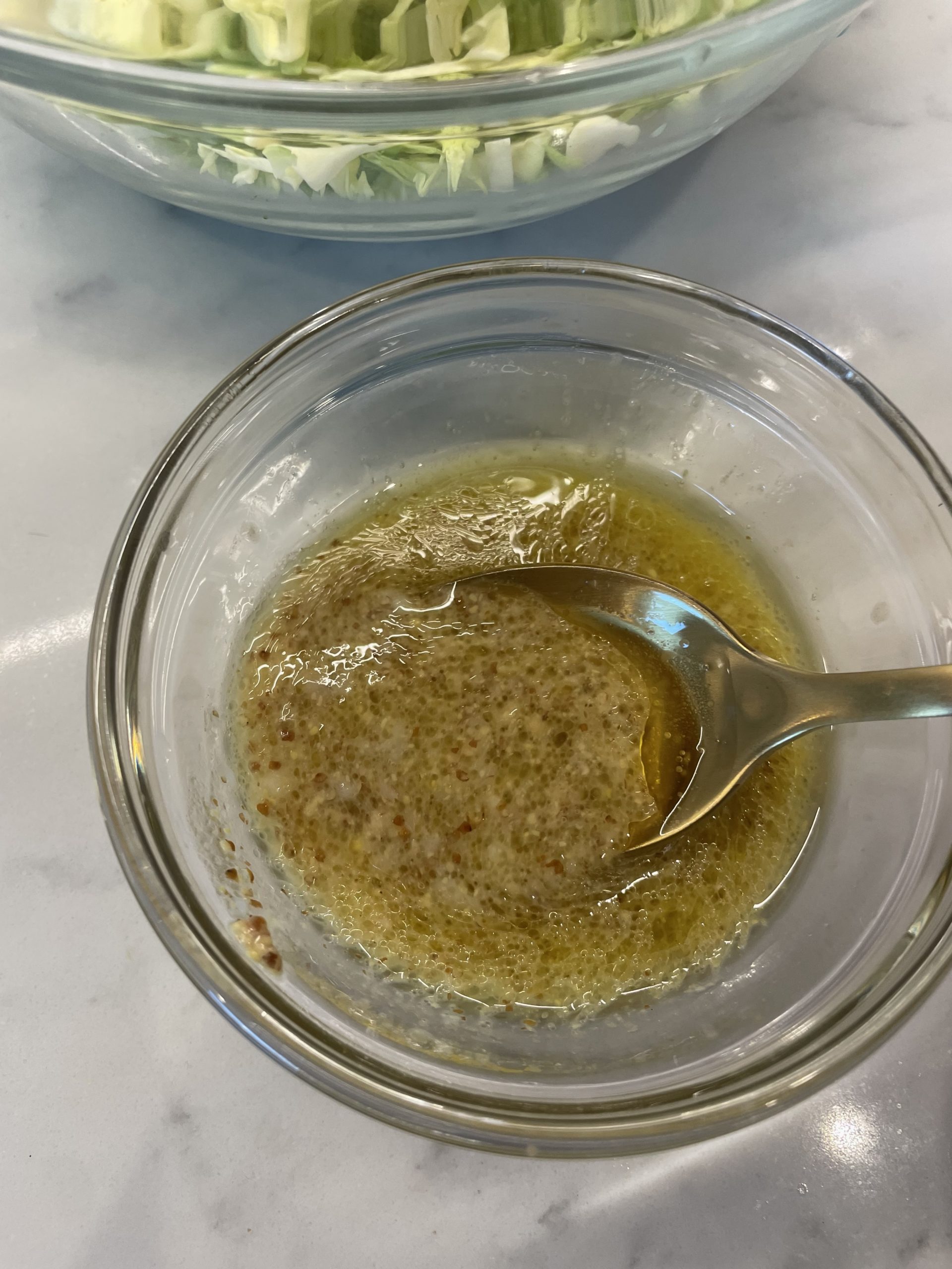 Add olive oil, lemon juice honey, garlic, vinegar, dijon mustard to a little bowl and mix until evenly combined. Add this dressing to the shaved brussels sprouts and mix until all of the sprouts are evenly coated. Then add in grated parmesan cheese and mix well.