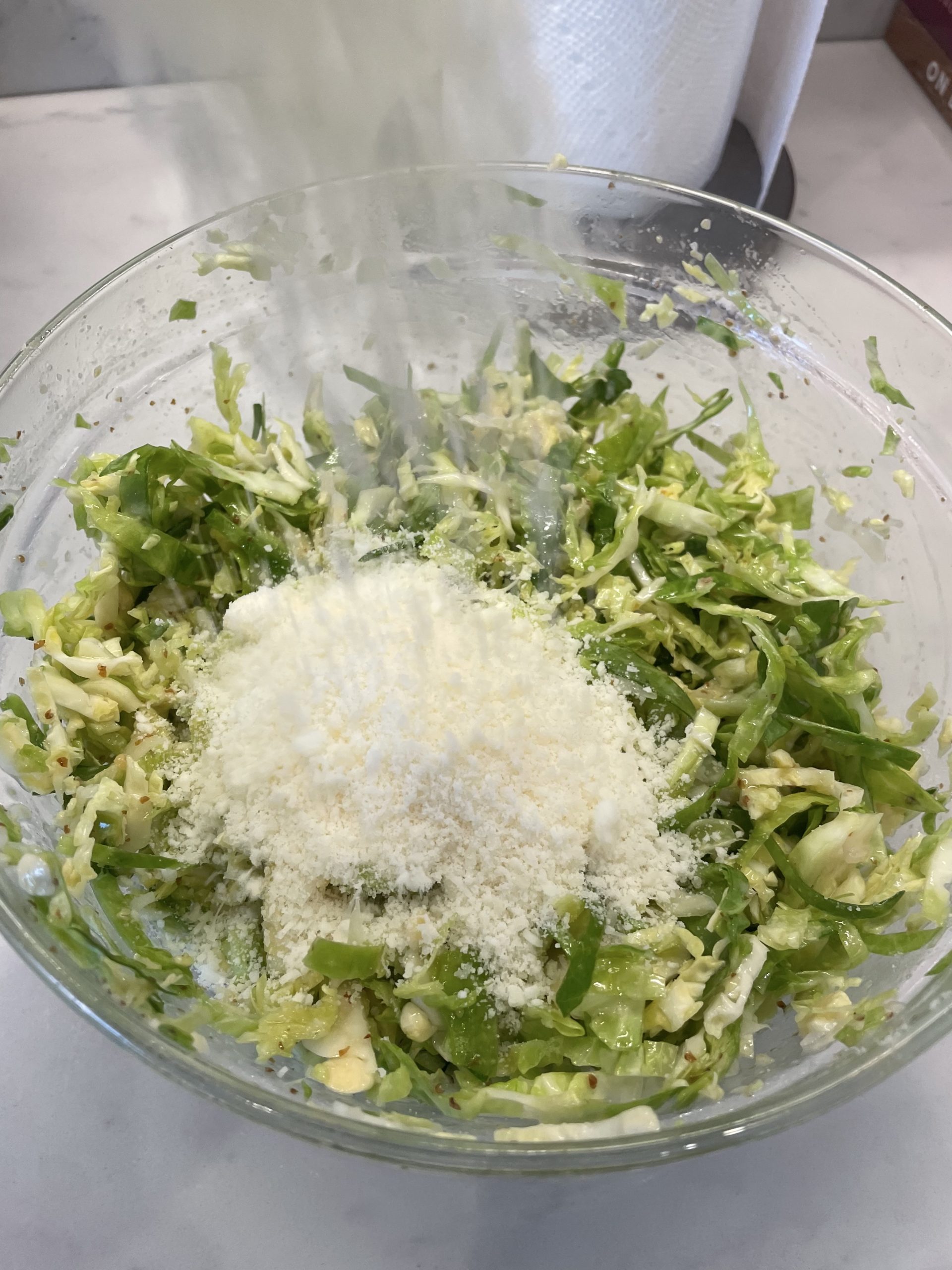 First, cut up your brussels sprouts into very thin slices so that each piece almost falls apart and you have shavings! Then add shaved sprouts to a bowl.