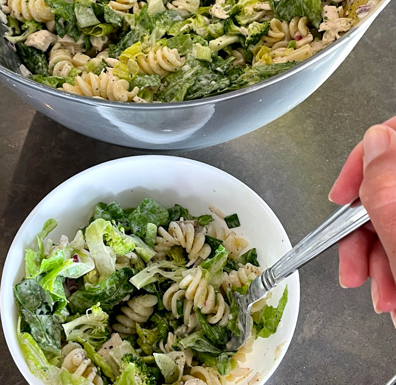Cook your pasta according to the box. As soon as your pasta is done, drain it in a colander and run the pasta under cold water to cool it down! While your pasta is cooking, chop up all of your veggies and put in a big bowl! In a separate bowl, whisk together all of the ingredients for the dressing and set aside. Next add your shredded chicken (all I did was boil it for 20 ish minutes, cool it and easily shred it) chilled pasta and dressing to the big bowl with all of your veggies! Add salt and pepper to taste, and optional avocado if you’d like! I know you’re supposed to let pasta salad sit in the fridge a little before eating, but I’m SO impatient (also hungry) so I just took a bowl right away and it was still DELICIOUS!! Hope you guys enjoy!