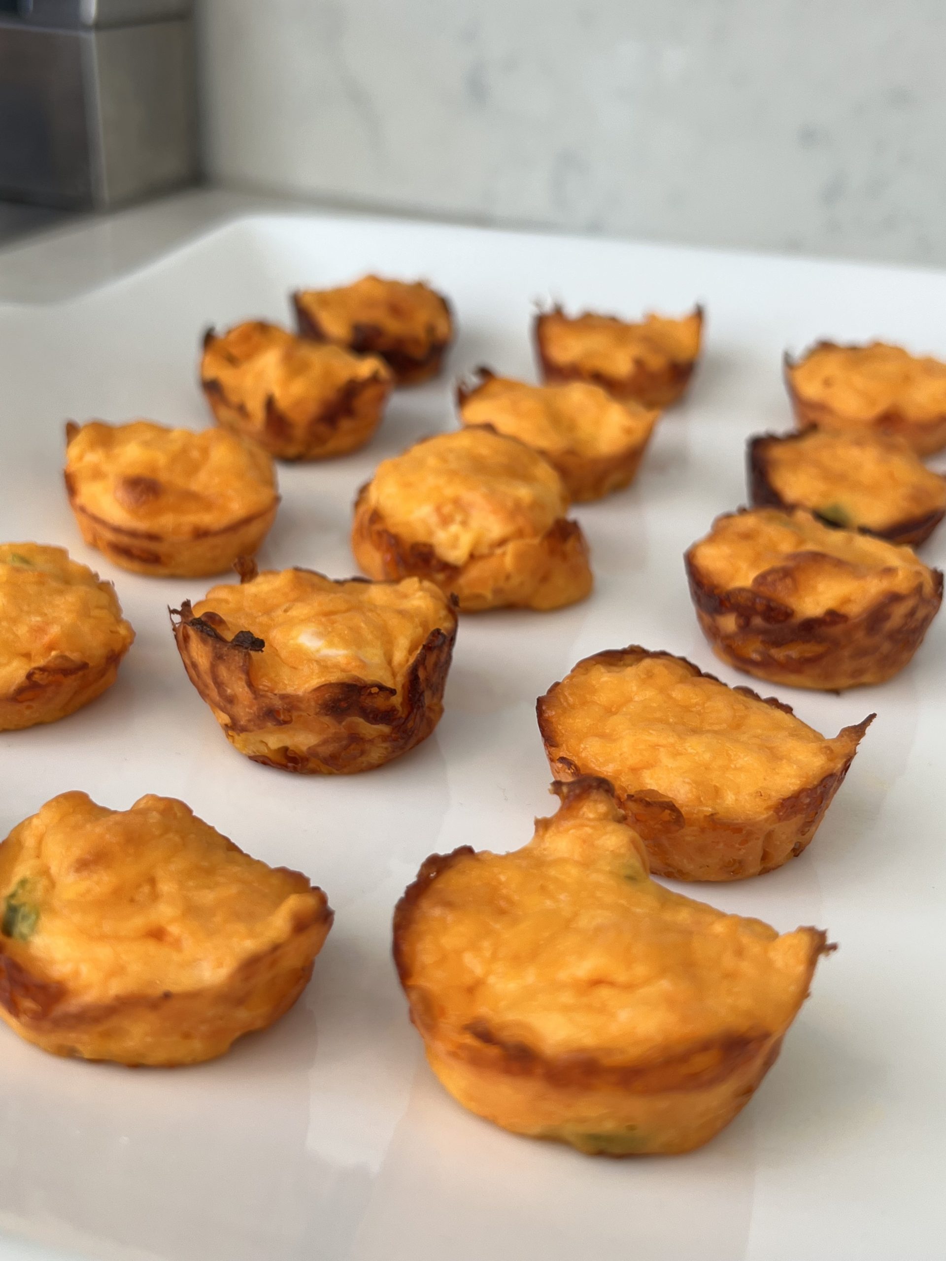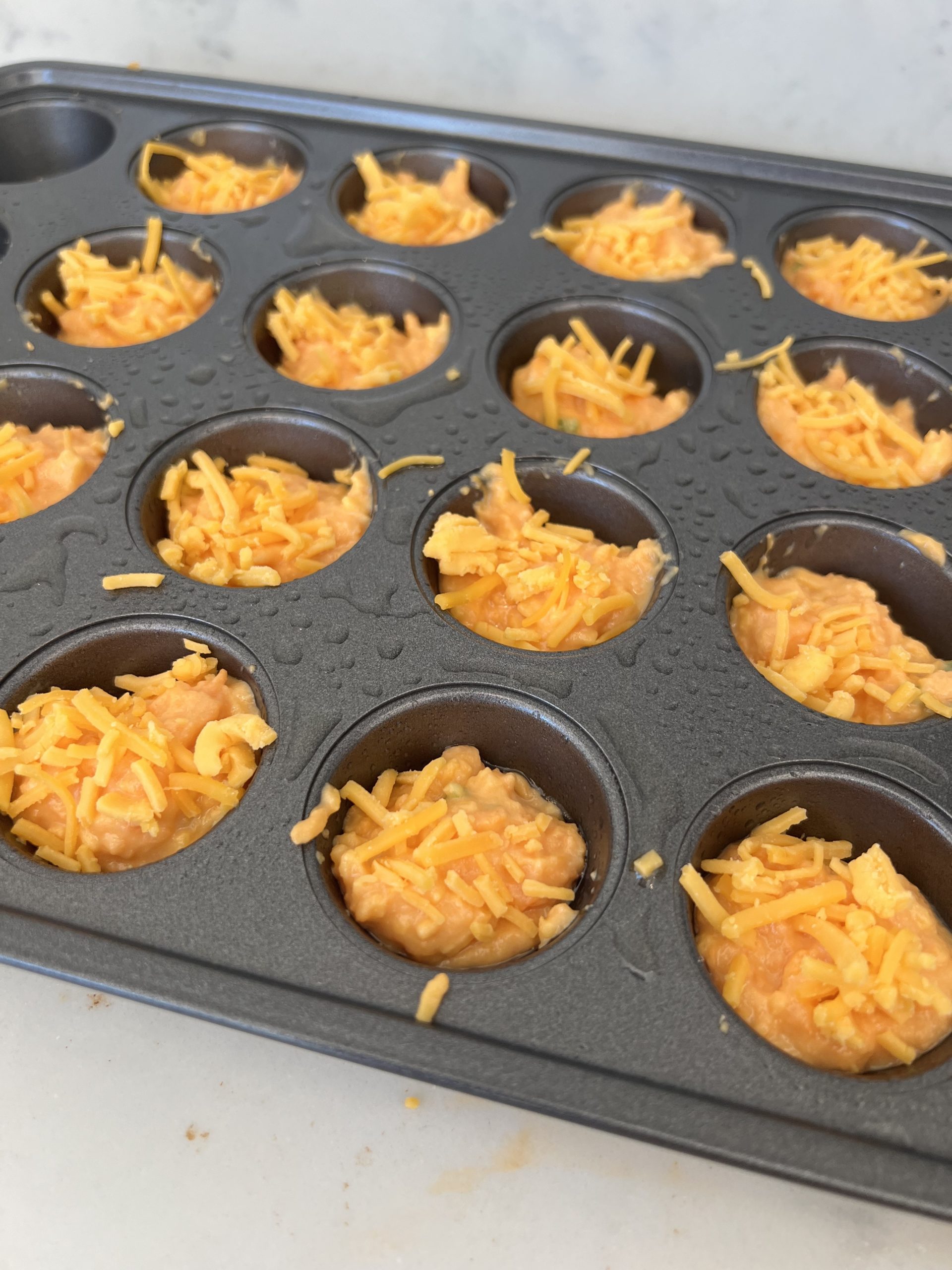Once mixed thoroughly, add even scoops into your pre-greased muffin tins. Top with a sprinkle of cheese in each muffin tin.