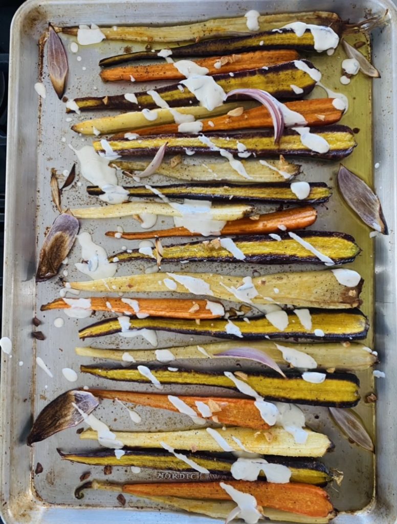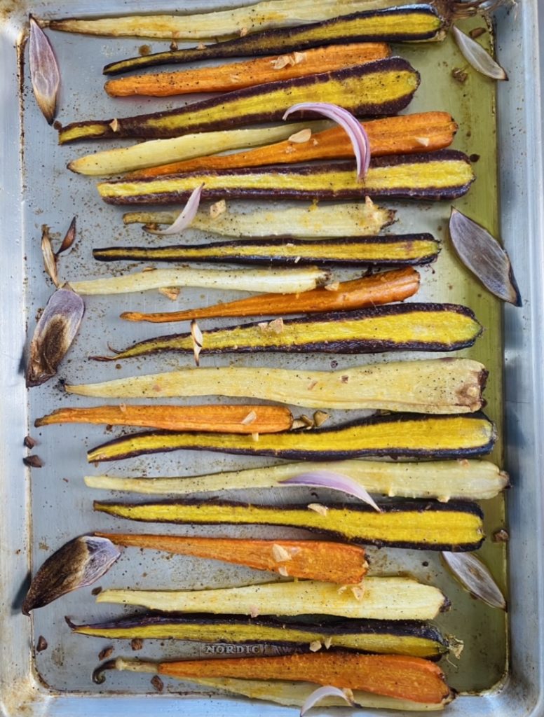 Peel and cut carrots in half and place on sheet pan with sliced red onion.