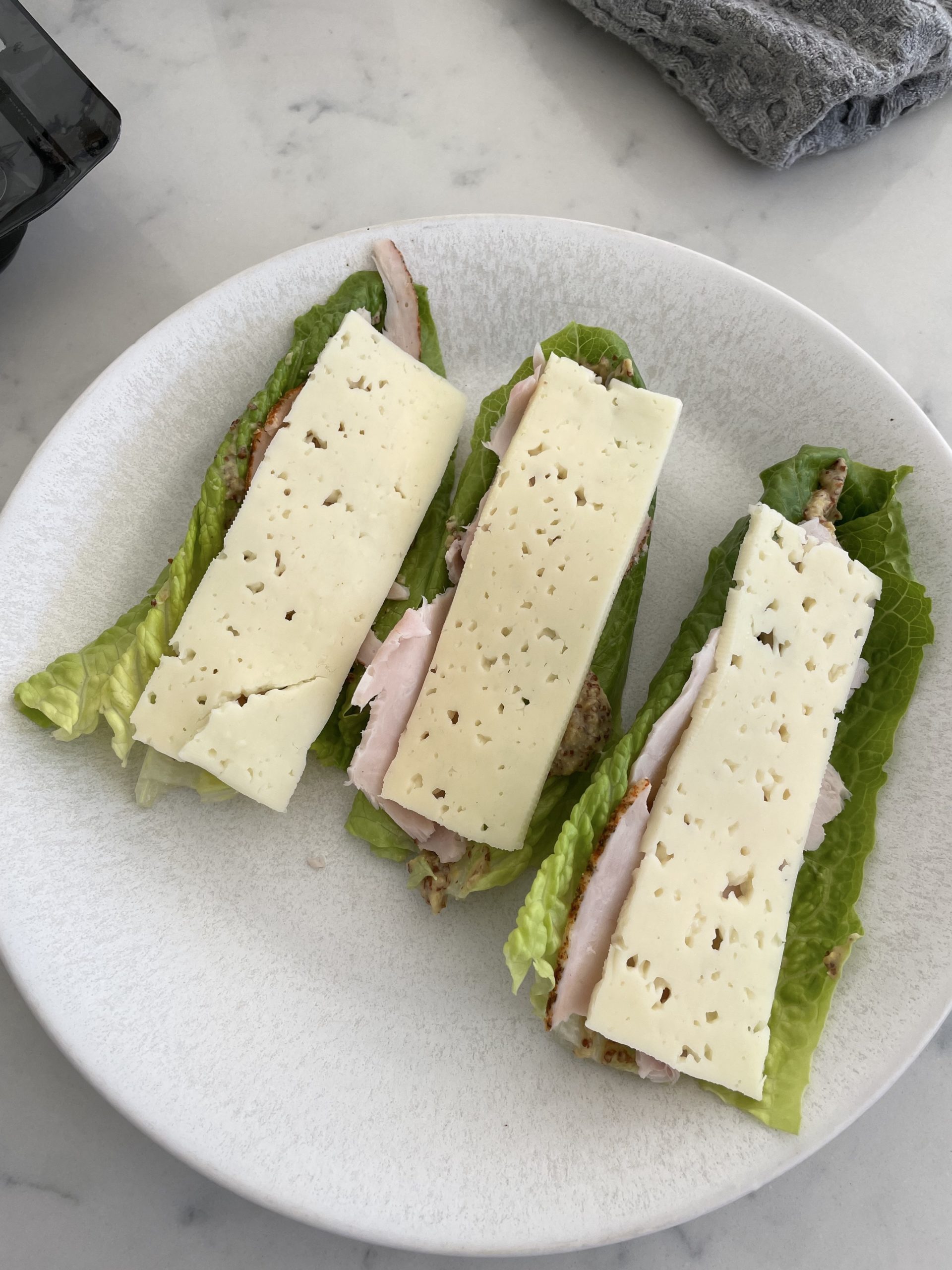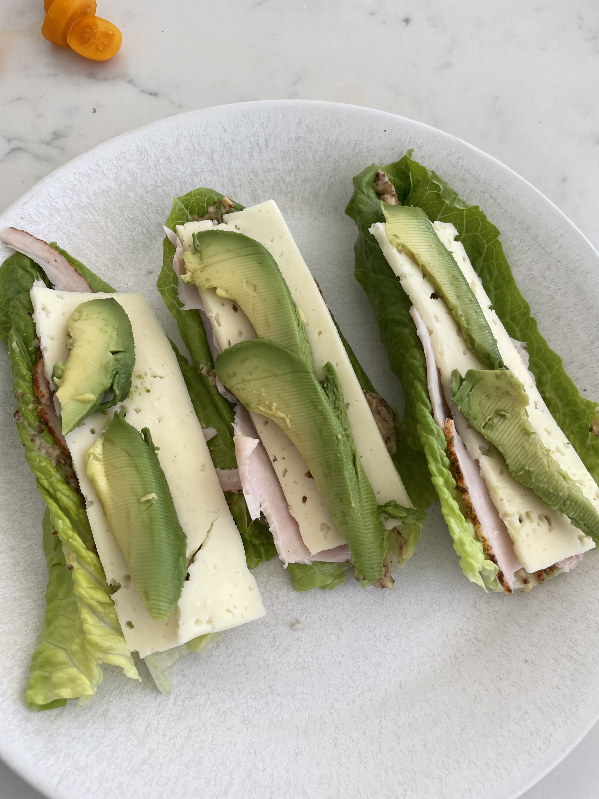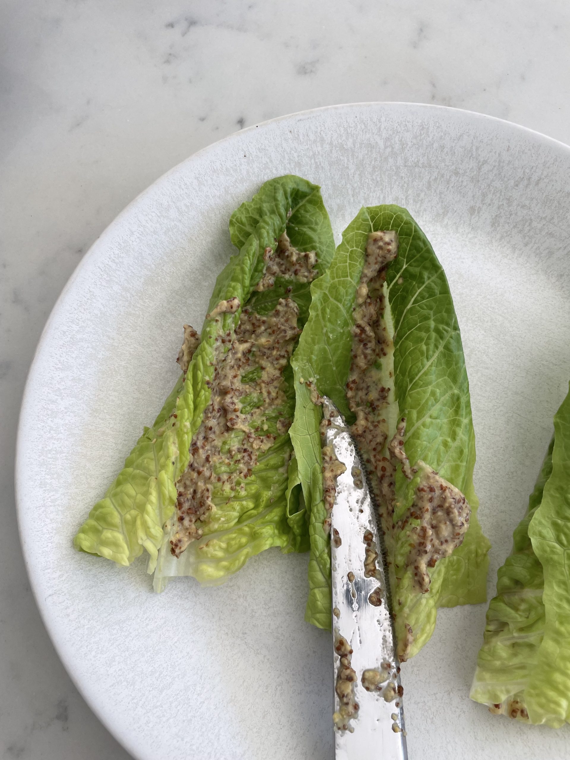 Rinse and dry the romaine & top with as much dijon mustard as you like. You could also use mayo or pesto here as well!