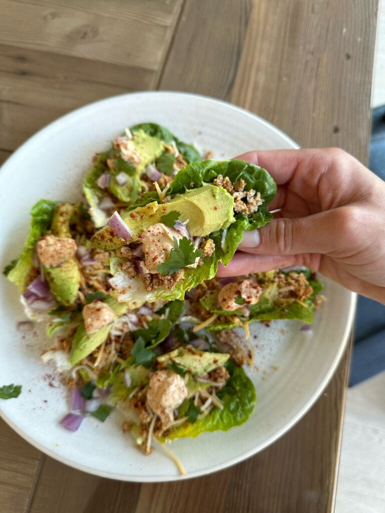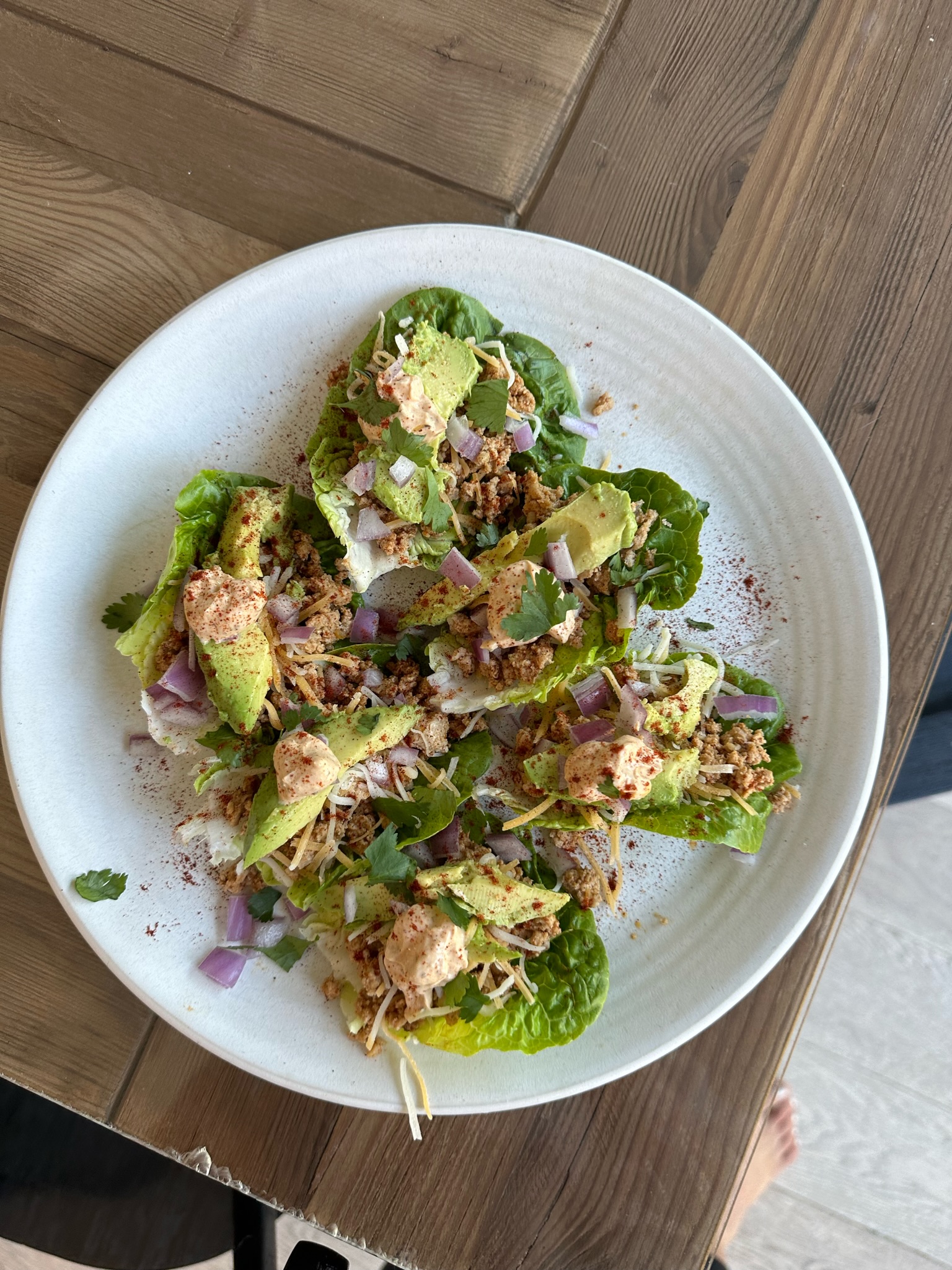 Top each lettuce cup with shredded Mexican blend cheese, red onion, cilantro, sliced avocado, and any optional toppings such as sour cream, Greek yogurt, or Trader Joe’s elote Greek yogurt dip.