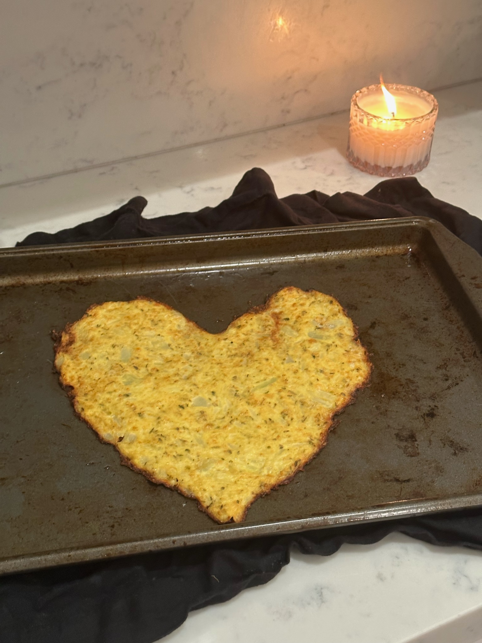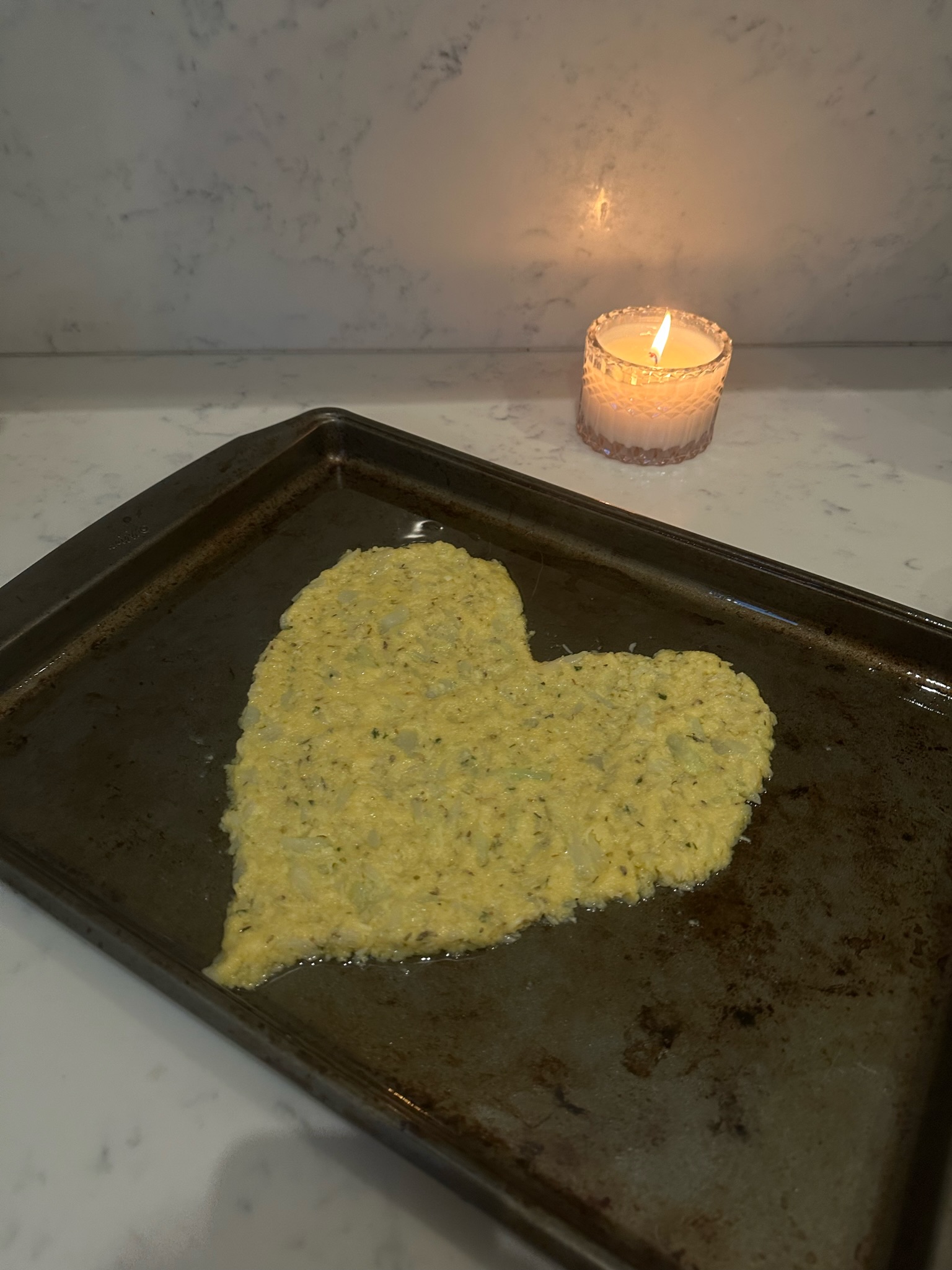 Shape the cauliflower mixture into a crust. A heart if you want!! Try to make the crust pretty thin as you can, the thicker it is, the soggier the crust will turn out.