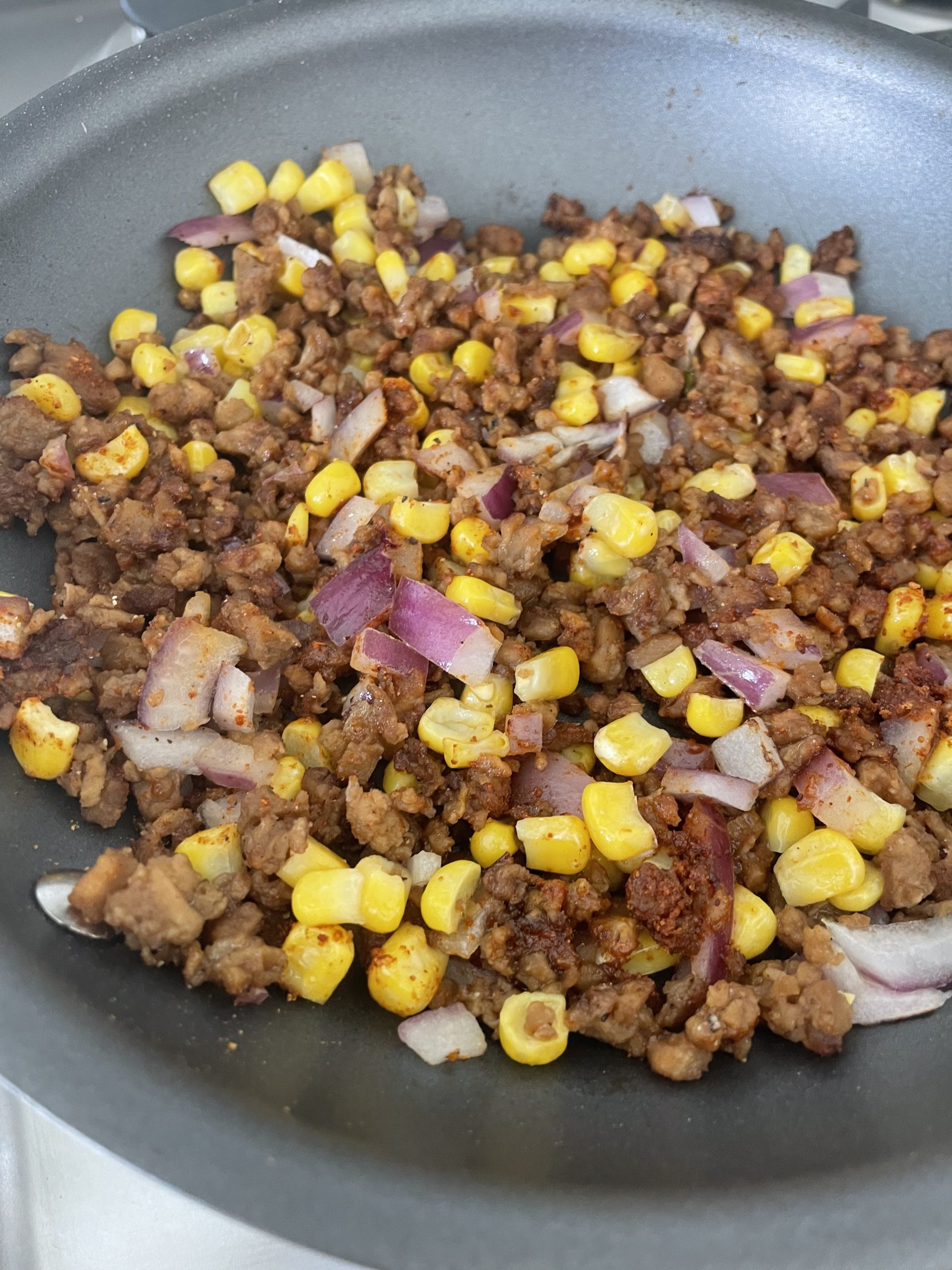 Once the meat is cooked after about 10 minutes, add in the corn, red onion and taco seasoning and cook for 3-4 more minutes or until the veggies have softened.