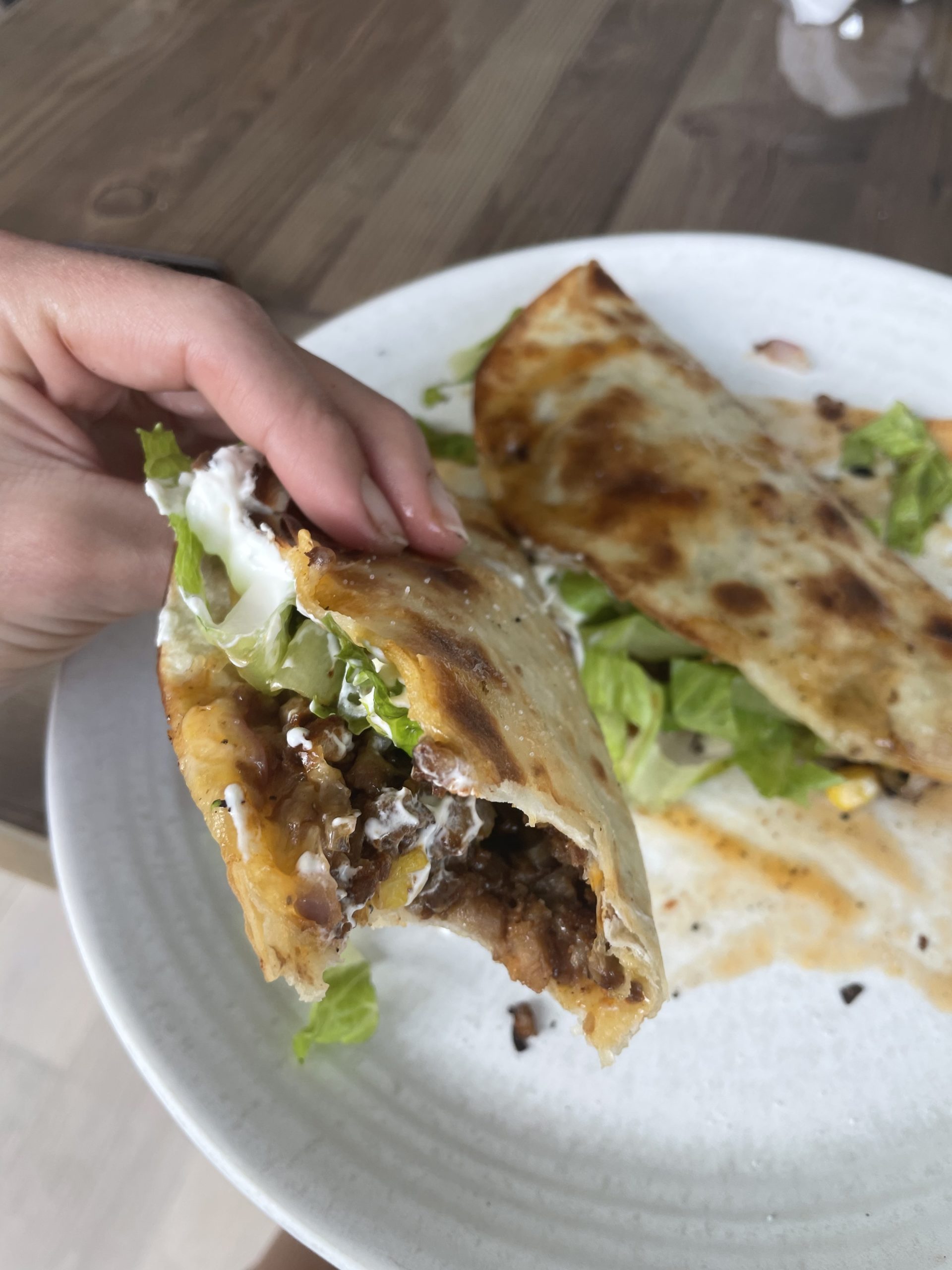 Add the protein and veggie mix to the quesadilla (you can feel free to add a little bit more cheese on top as well), then fold in half, and add some olive oil on the outside and broil for 1-2 minutes on each side until the tortillas are nice and crispy!