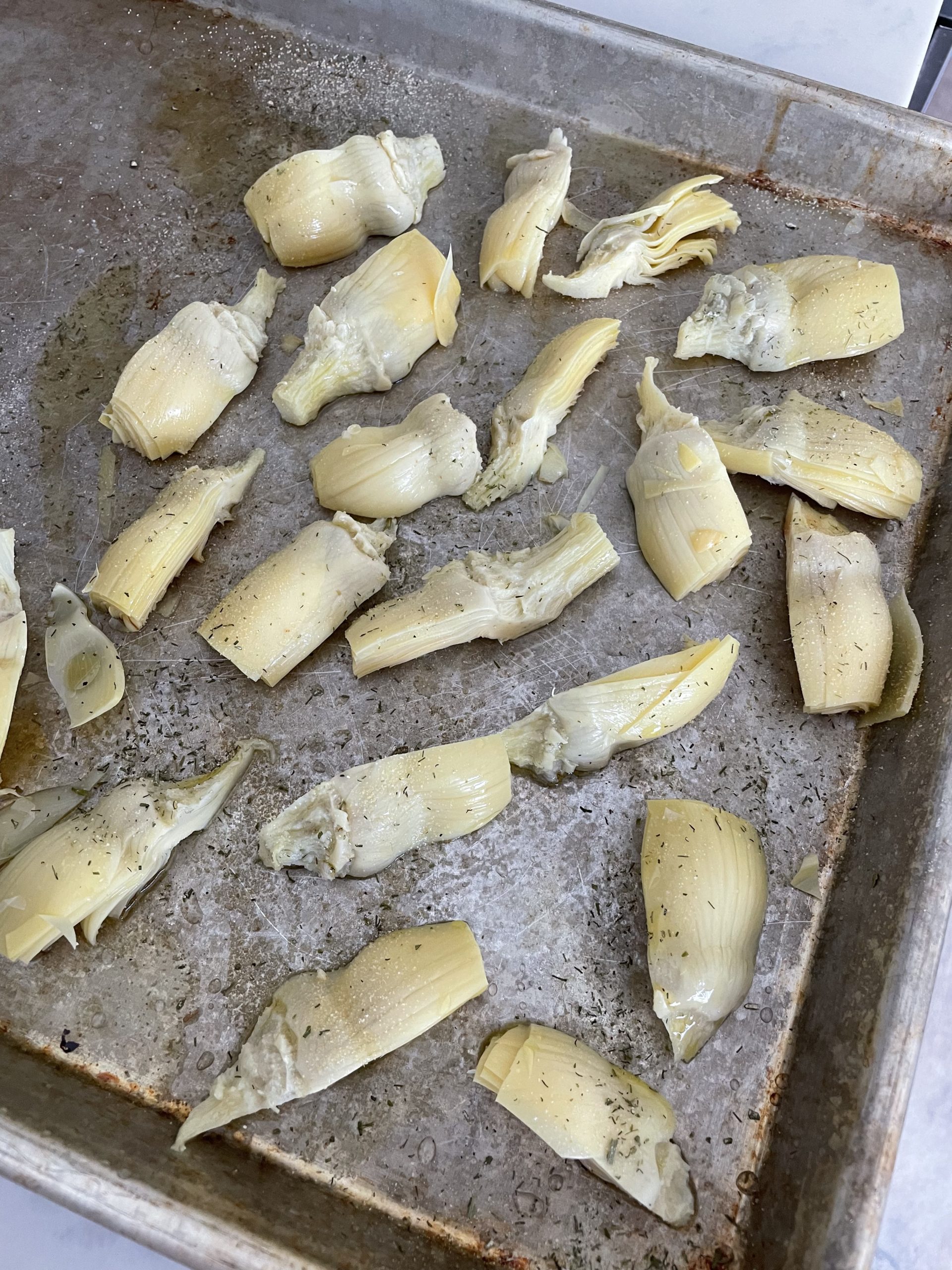 First, dice your artichoke hearts up into quarters and bake them in the oven at 400 degrees for 20-25 minutes with some olive oil, oregano, and garlic powder. Face them down to get crispier!