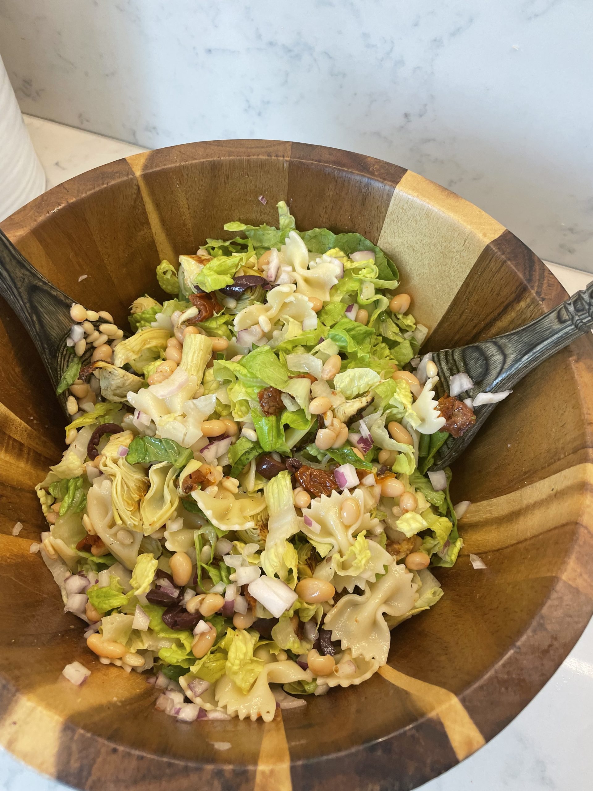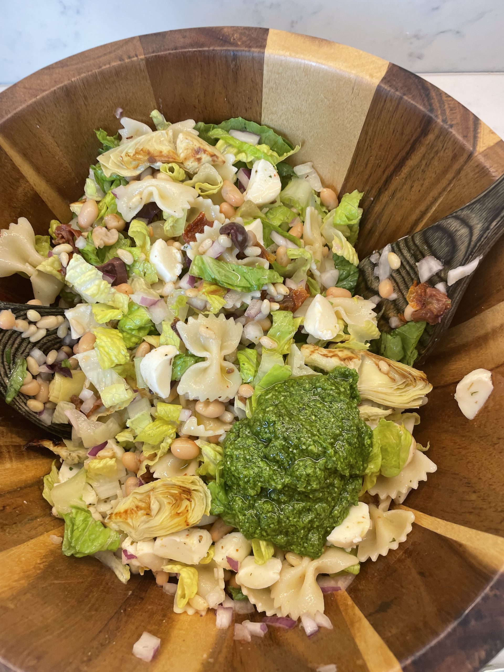 Add the chopped veggies to a bowl with white beans, cooked pasta, pine nuts, the roasted artichoke hearts and diced mozzarella. Toss until everything is evenly distributed.